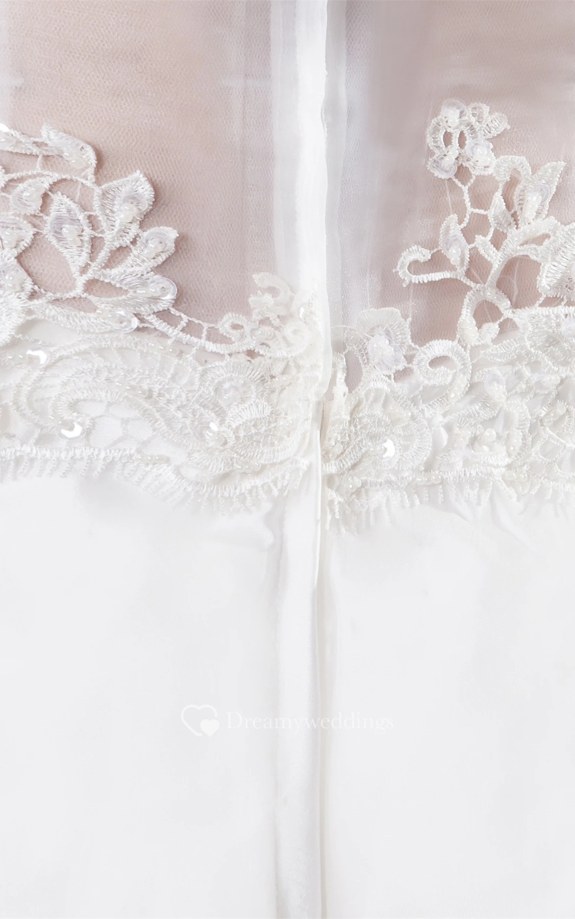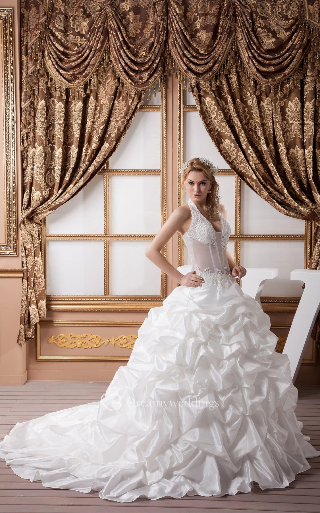 Deep-V-Neck Ruffled Pick-Up Illusion Waist and Gown With Appliques