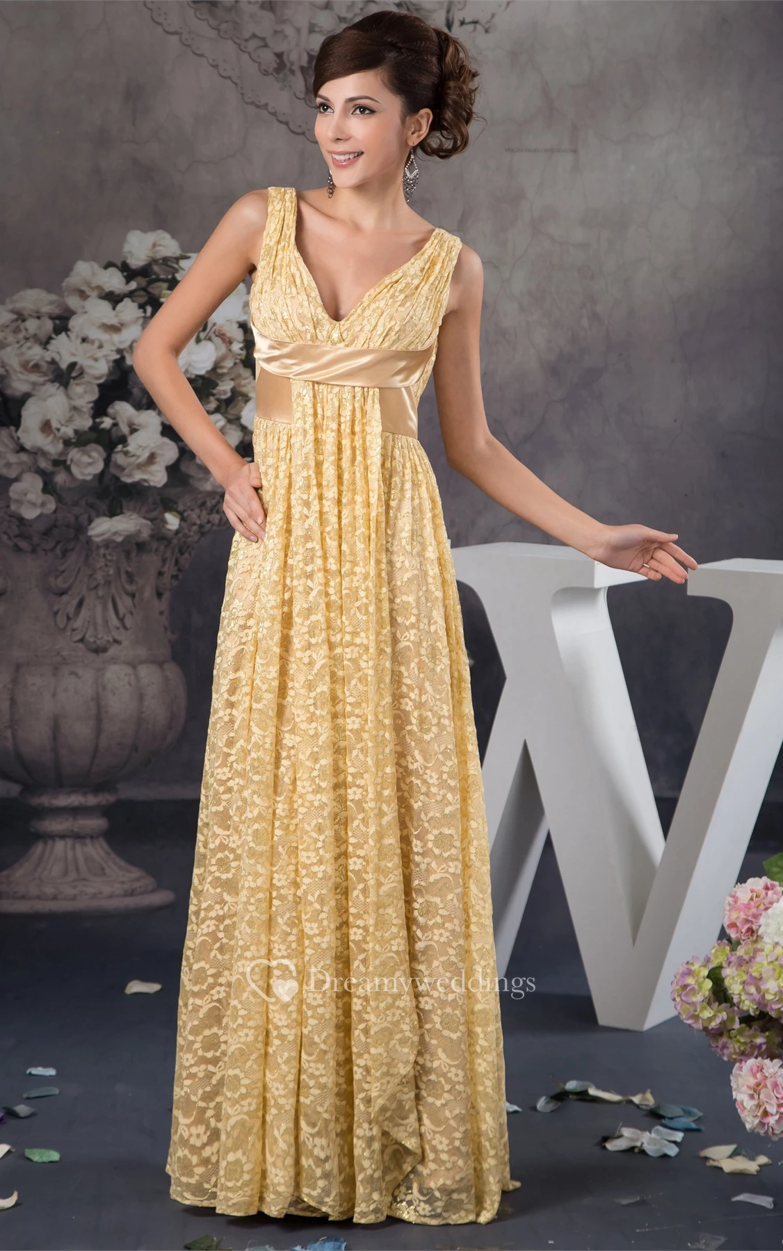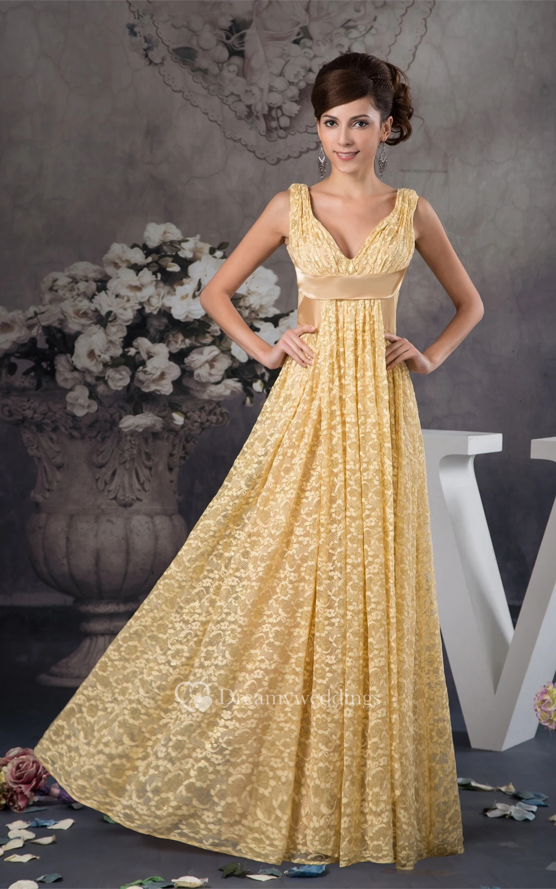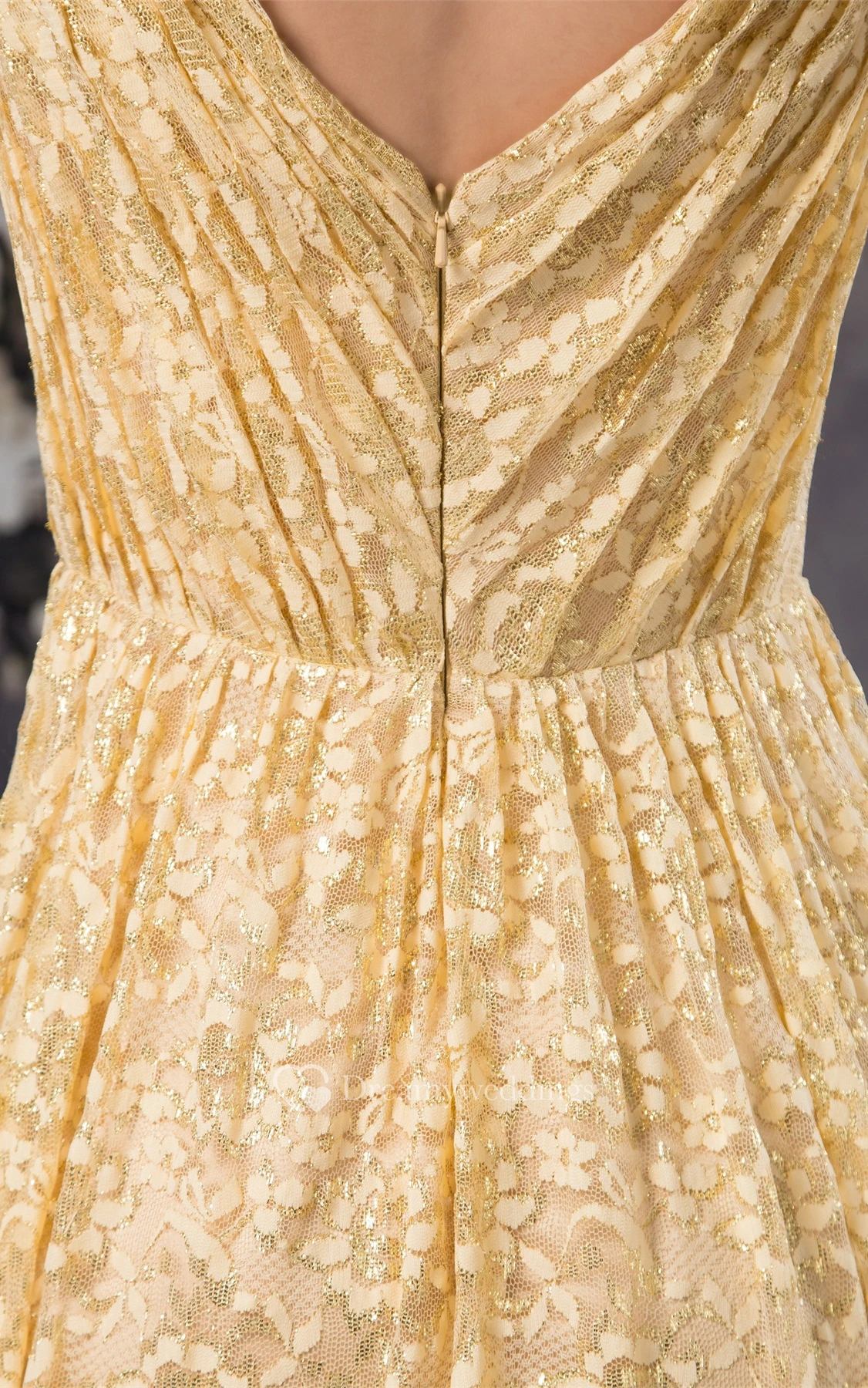 Deep-V-Neck Sheath Sleeveless Pleats and Dress With Lace