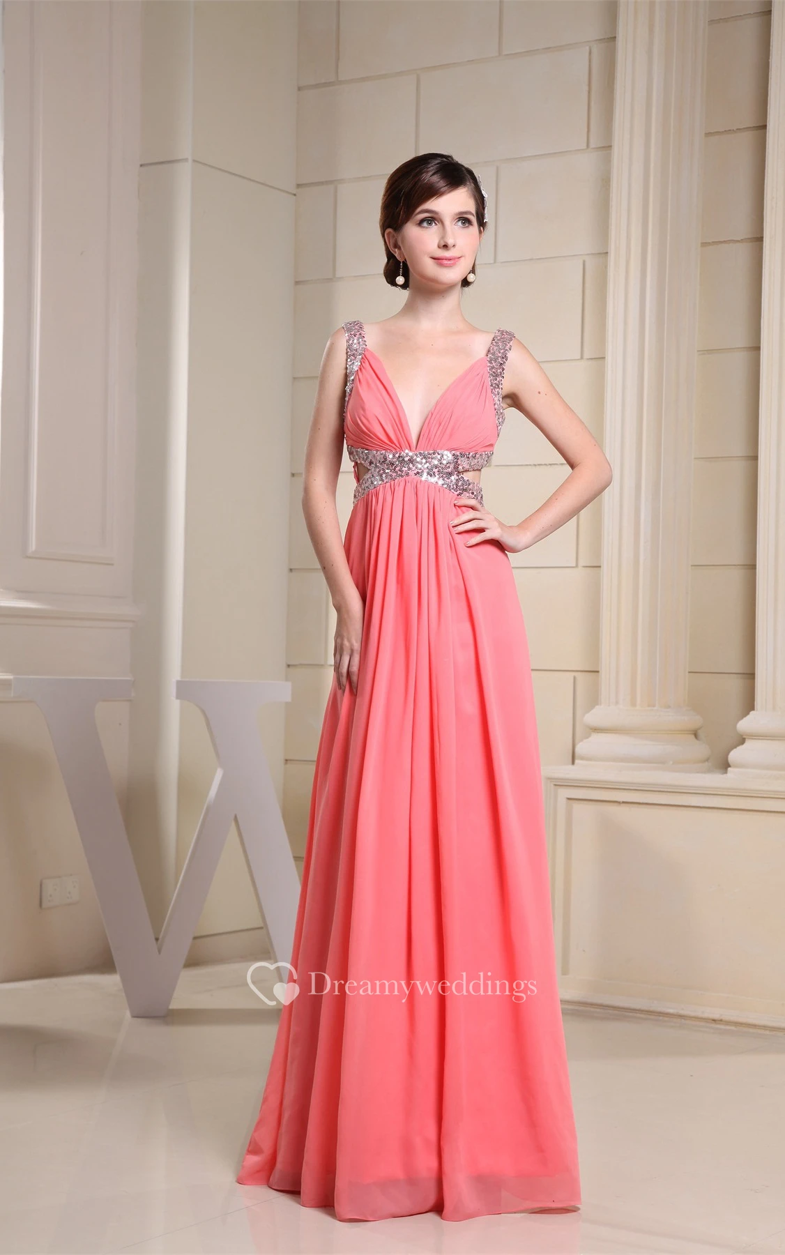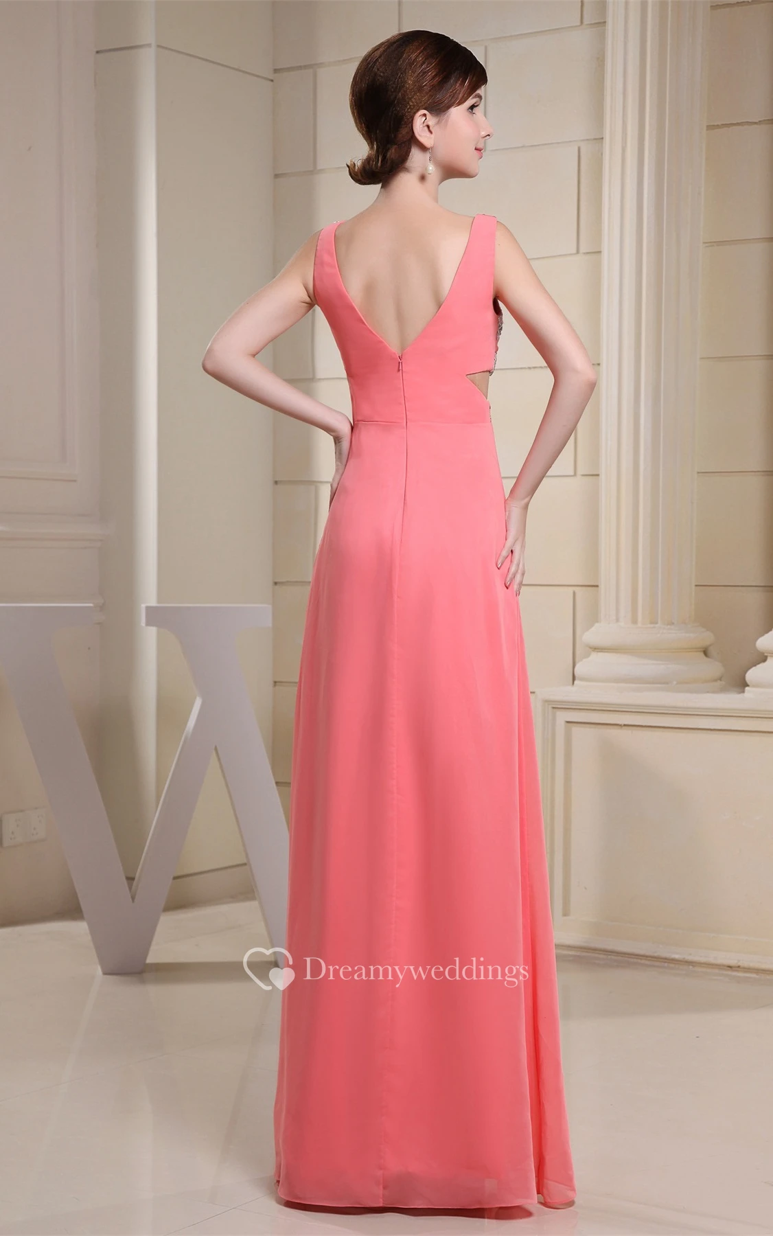 Deeply V-Neck Sleeveless Ruched A-Line Floor Length Gown With Side Keyhole and Crystal Detailing