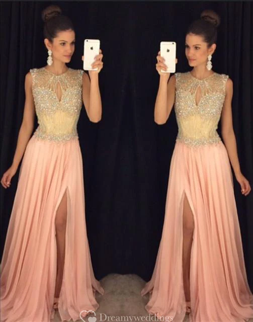 Delicate Beadings Chiffon Illusion Prom Dress Front Split Sleeveless