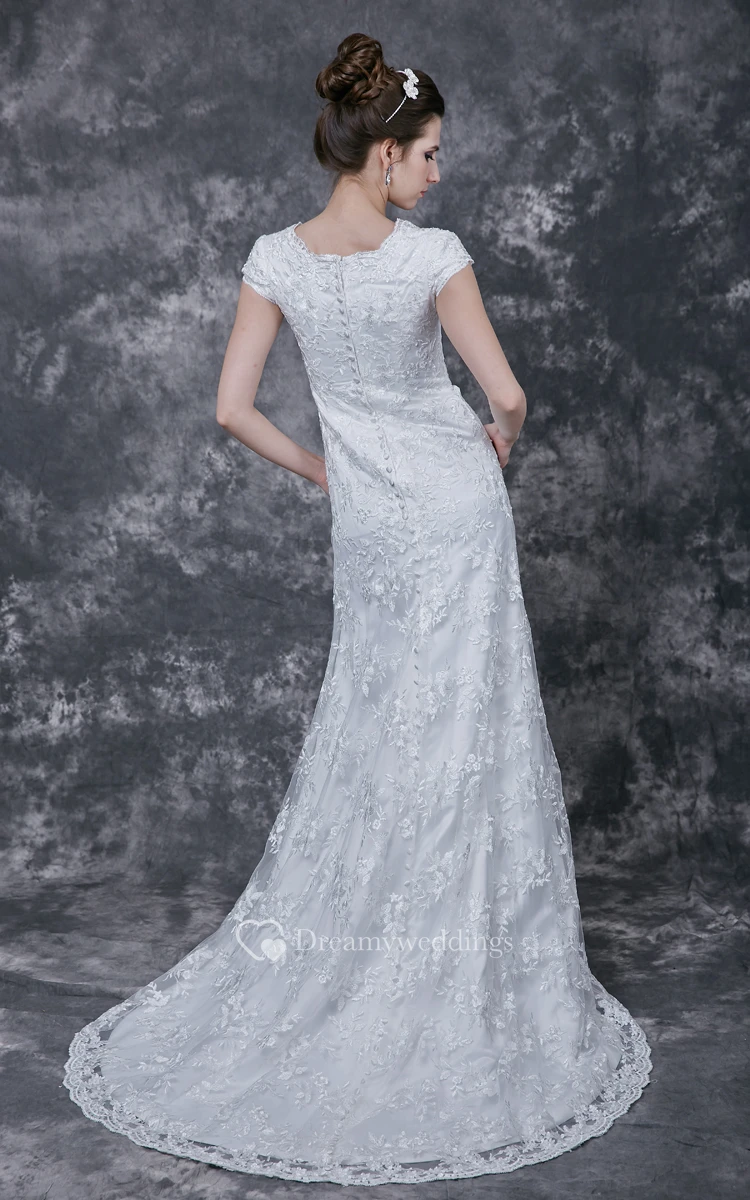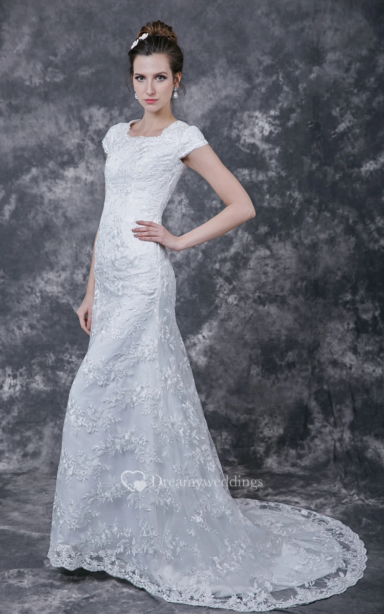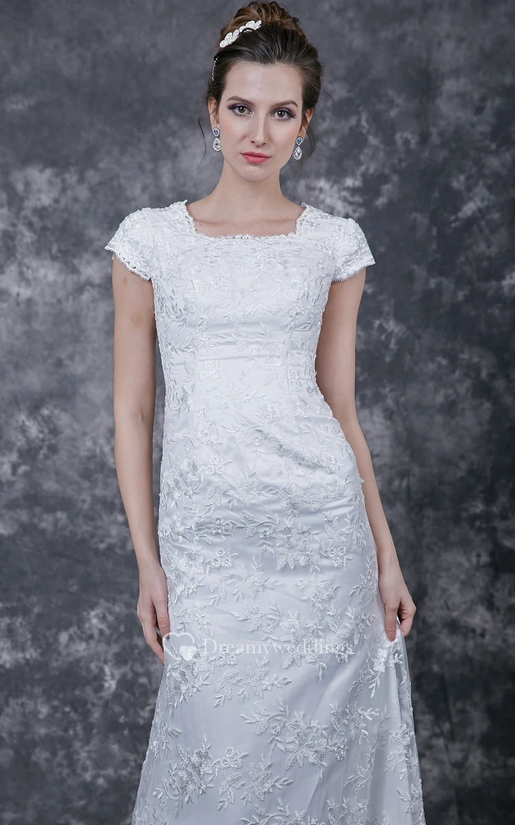 This A-line wedding dress is stylish in its simplicity. The dress has a square neck and short sleeves with delicate lace edging. It pulls in slightly at the natural waist and then falls into a floor-length skirt with a brush train with a scalloped hemline. The embroidered lace pattern adds lovely depth and detail to the gown.