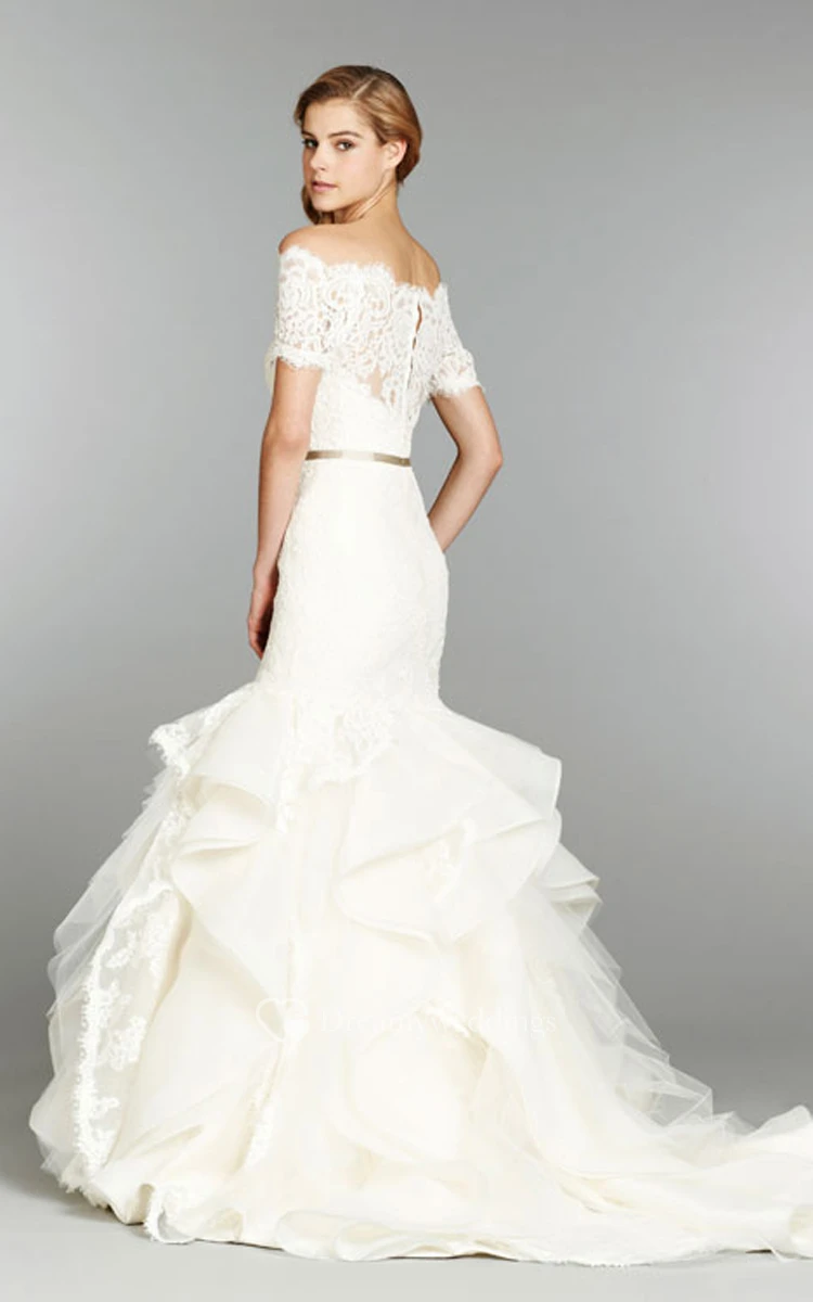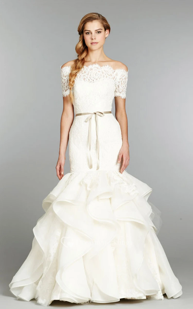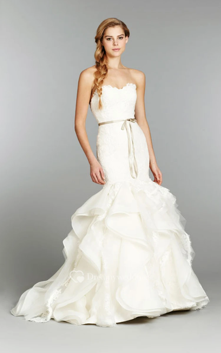 Make yourself a gift by choosing this exquisite gown to shine in on your special day. Delicate sweetheart neckline strapless lace bodice gently ties you in the slim fitting silhouette till the hipline from where the mermaid ruffled organza flimsy skirt with lace insets cascades to the feet forming a court train behind. Detachable off-shoulder lace bolero ideally complements the gown letting you create two different images and moods. Thin silky ribbon adorns the waist.