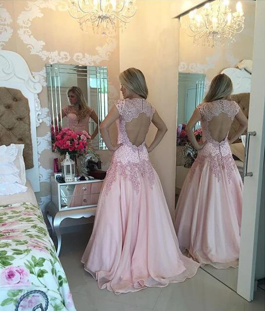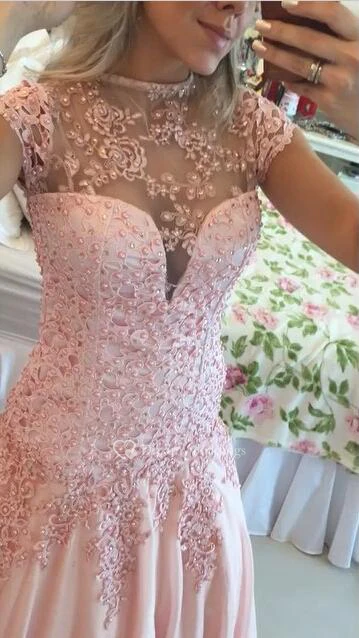 Delicate Pink Lace Appliques Prom Dress Sweep Train