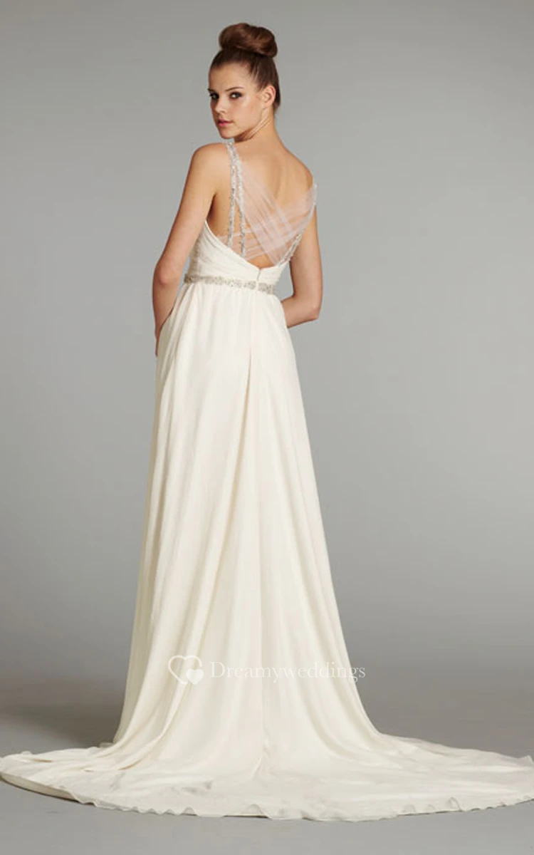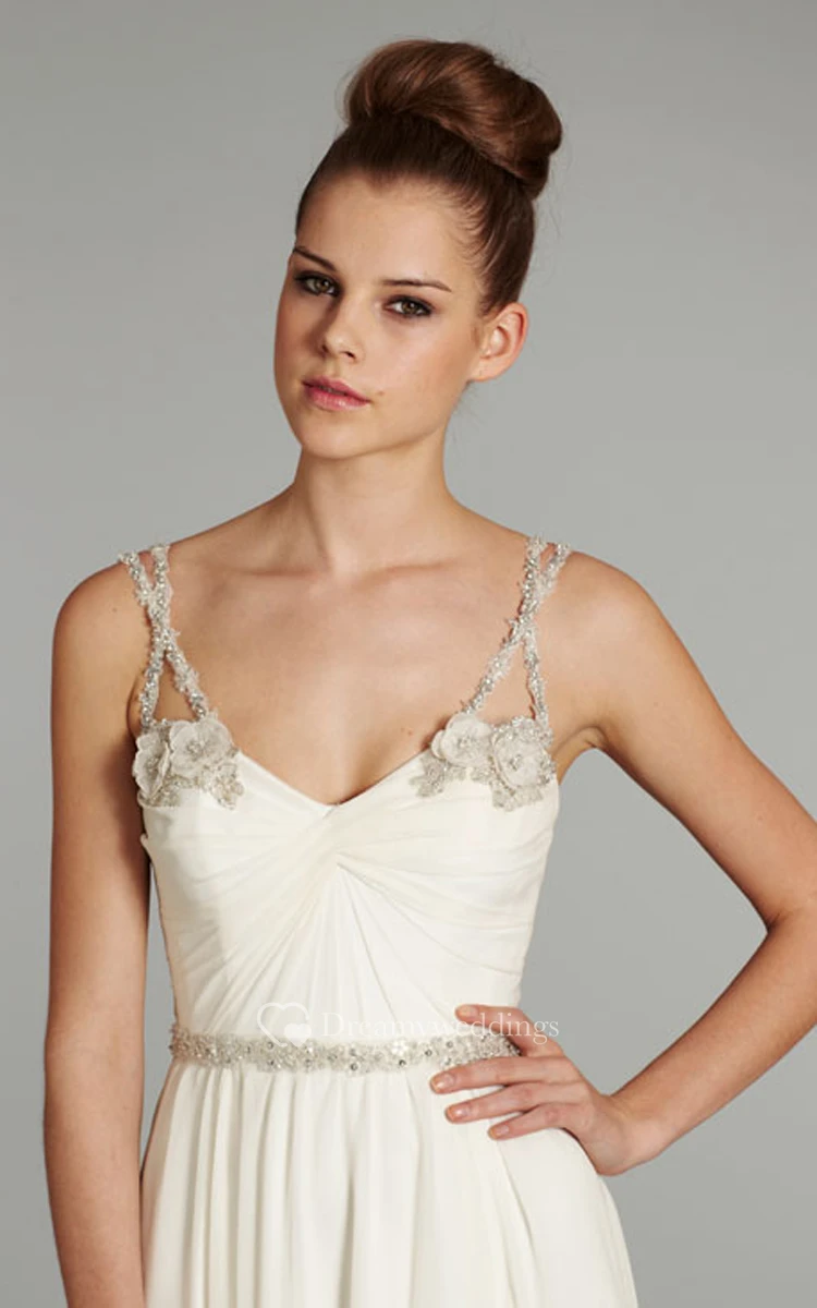 Delicate Sleeveless Draped Bodice Long Gown With Floral Beaded Straps