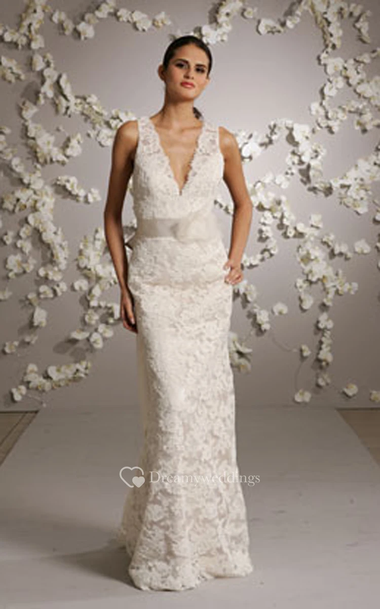 Delicate Sleeveless V-Neck Lace Gown With Bow at Back