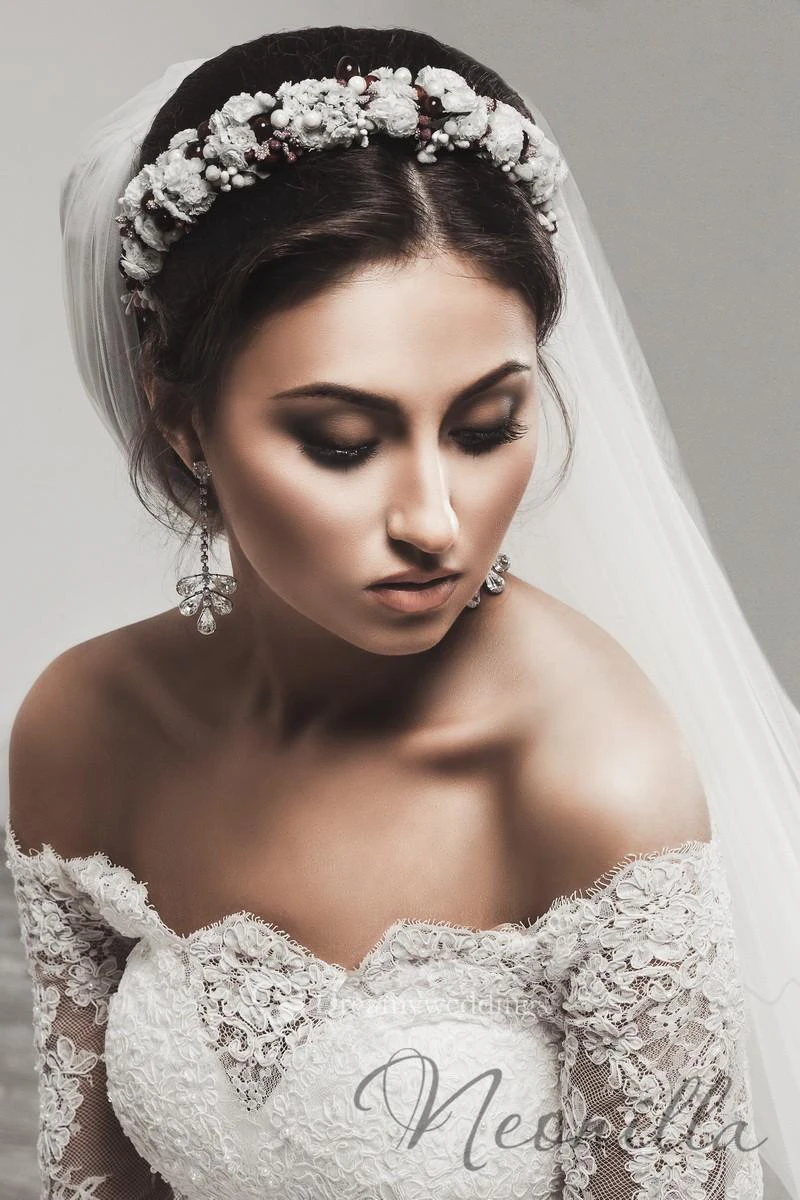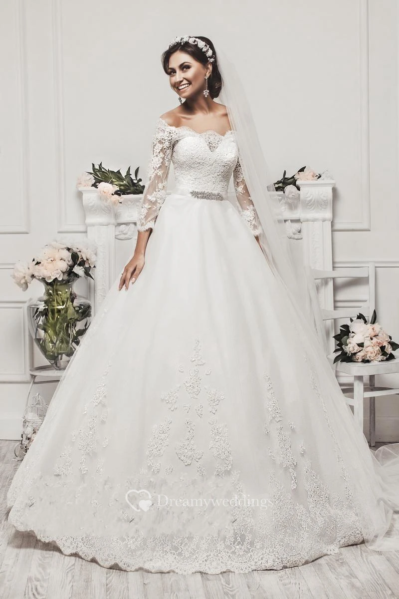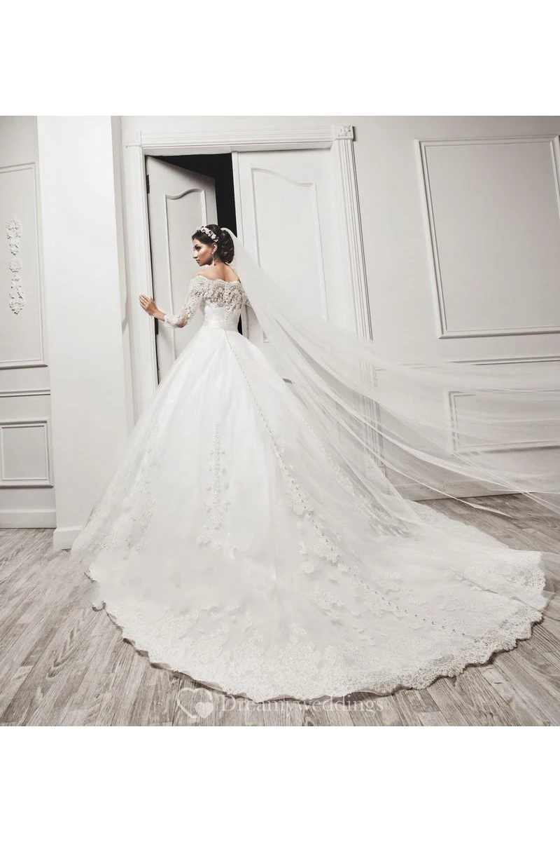 Delicate Tulle Lace Appliques Wedding Dress 3-4-Length Sleeve Beadings