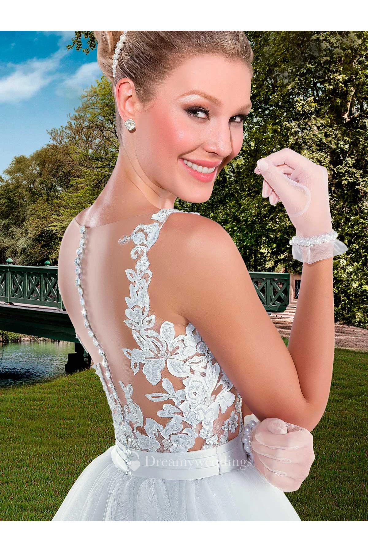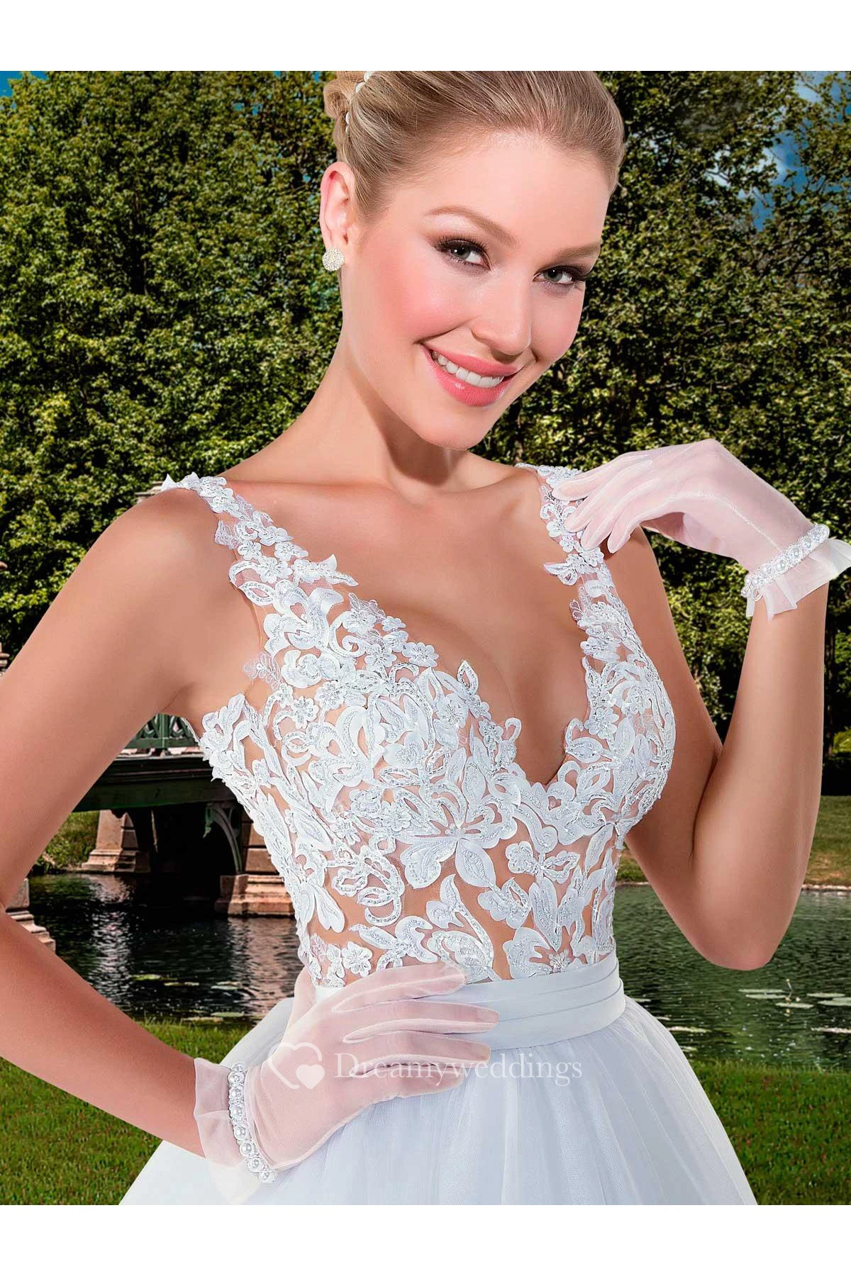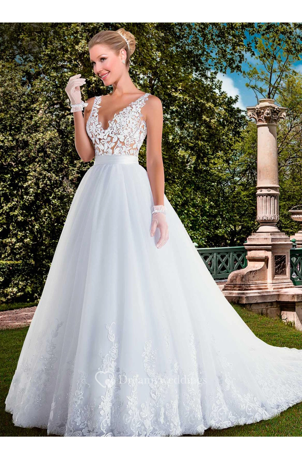 Delicate V-neck Tulle Lace Wedding Dress Appliques Sweep Train