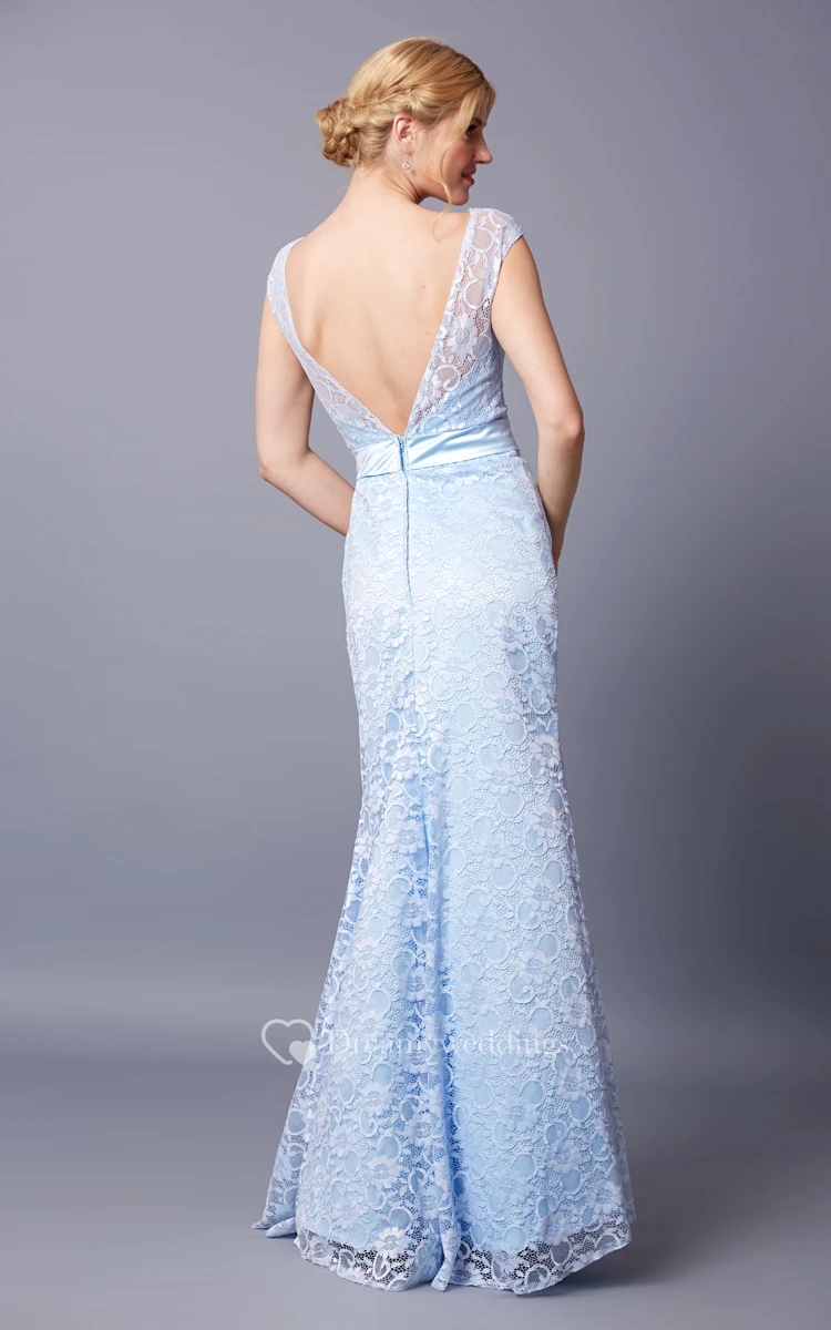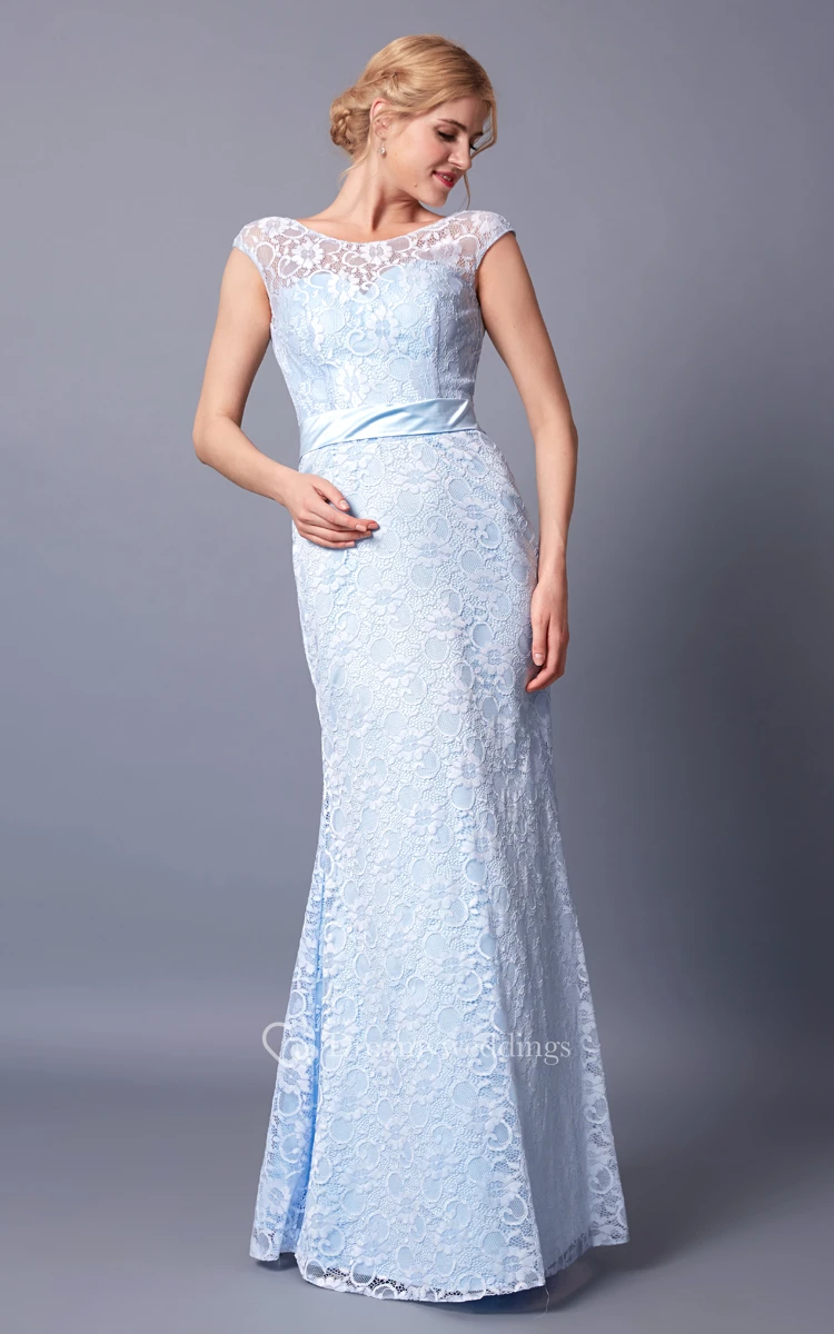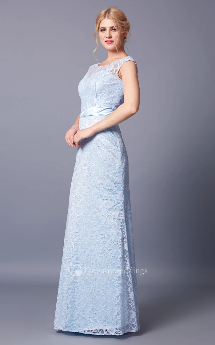 Demure Cap Sleeve Jewel Neck Long Lace Dress With Sash