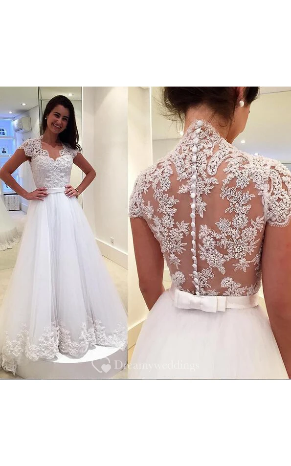 Dreamy Cap Sleeve Lace Wedding Dress Zipper Button Back Bridal Gowns