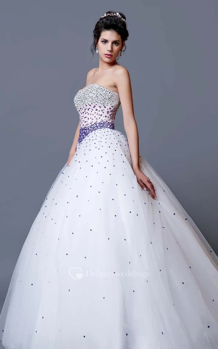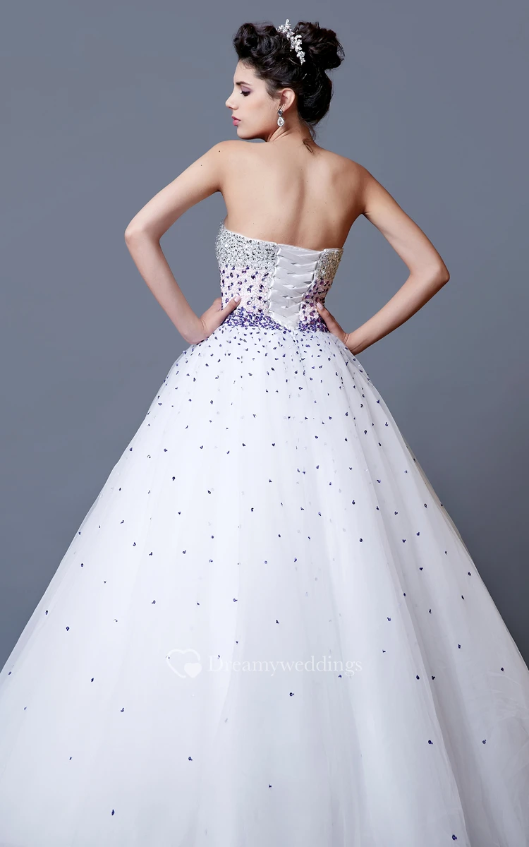 The snug fitting bodice of this princess style gown, has an ombre technique to the decorative beadwork. Finishing with a sweetheart neckline, that can be offset by the matching illusion fabric bolero. A strapless and backless dress with a criss cross ribbon fastening to the back. The quinceanera skirt line is fashioned with decorative beads. Custom made from a quality tulle fabric.