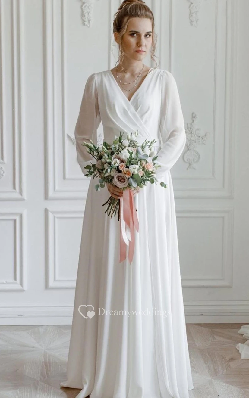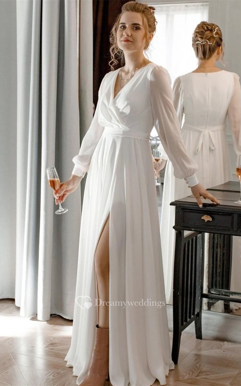 Elegant A Line Chiffon V-neck Wedding Dress with Sash and Split Front