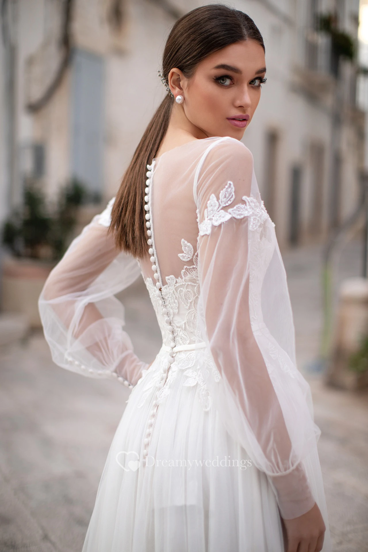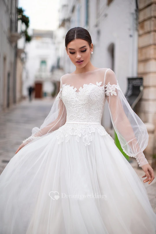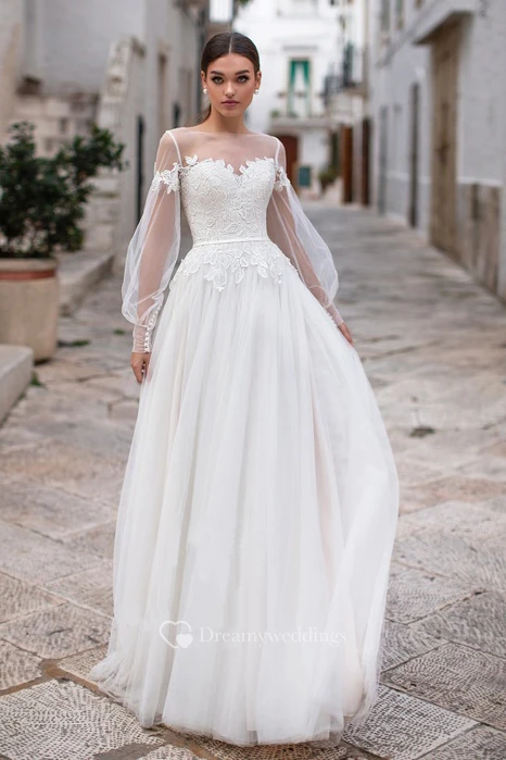 Elegant Bateau Long Sleeve Floor Length Wedding Dress with Applique and Pleats