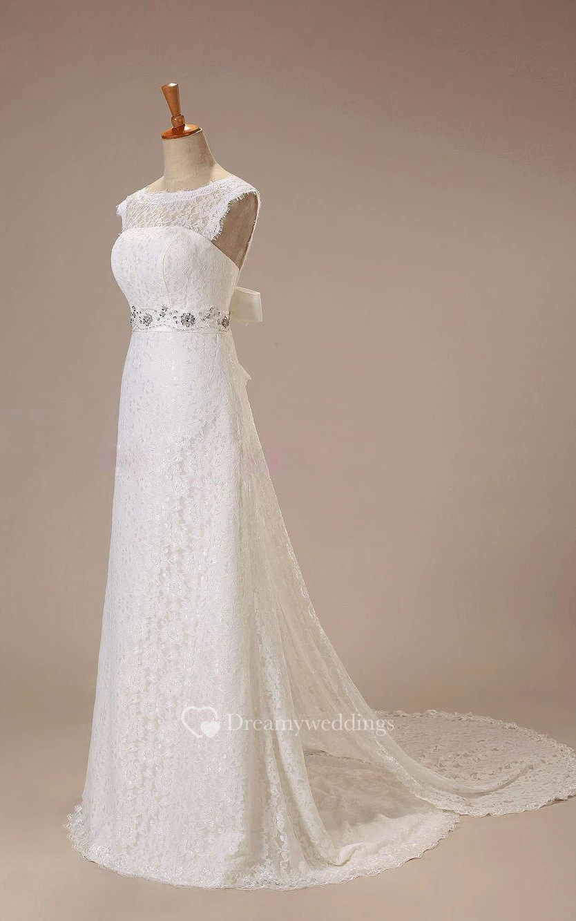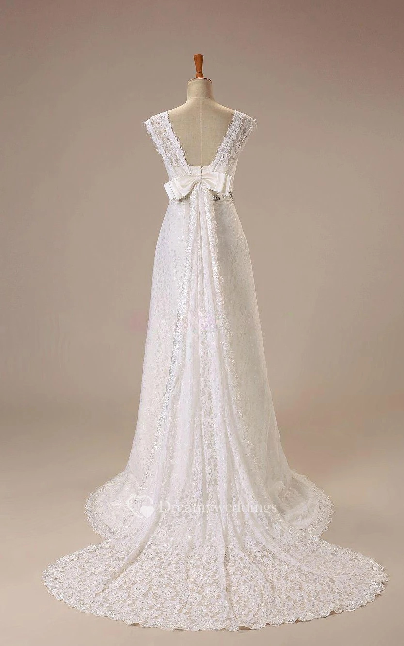 Elegant Cap Sleeve Bateau Neck Lace Dress With Beaded Waist and Back Bow