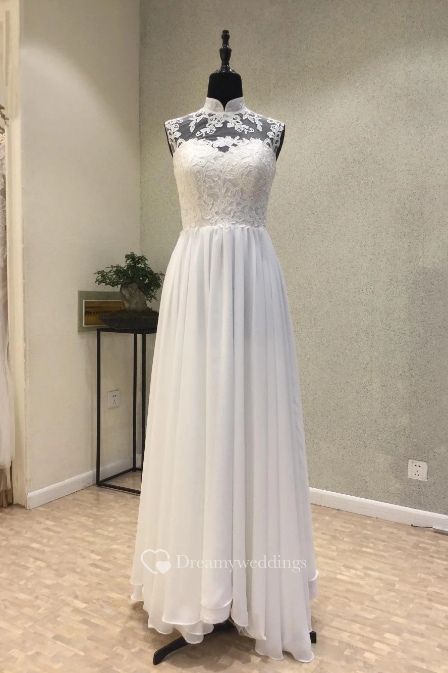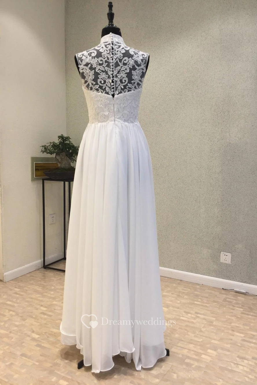 Elegant Garden Style Chiffon Sheath High-neck Sleeveless Wedding Dress with Lace