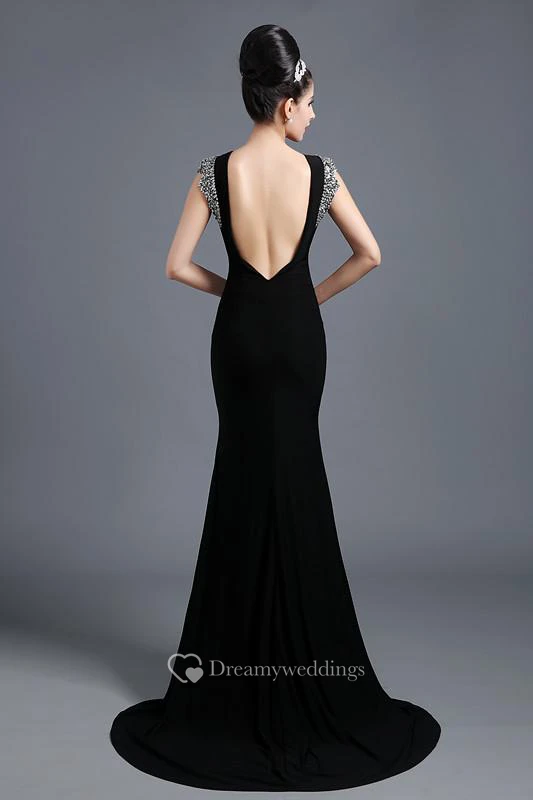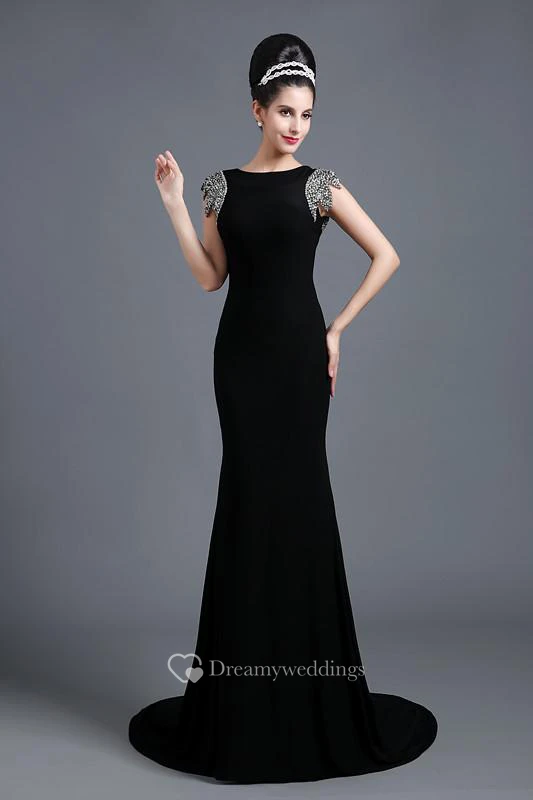 Elegant Jewel Cap Sleeve Black Prom Dress With Sequins Beadings