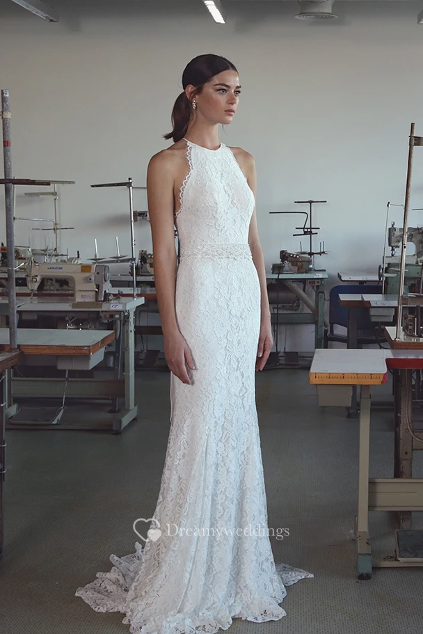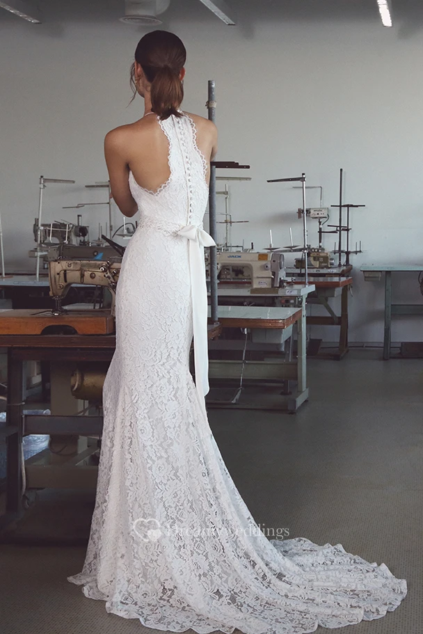Elegant Lace Halter Sleeveless Sweep Train Wedding Dress