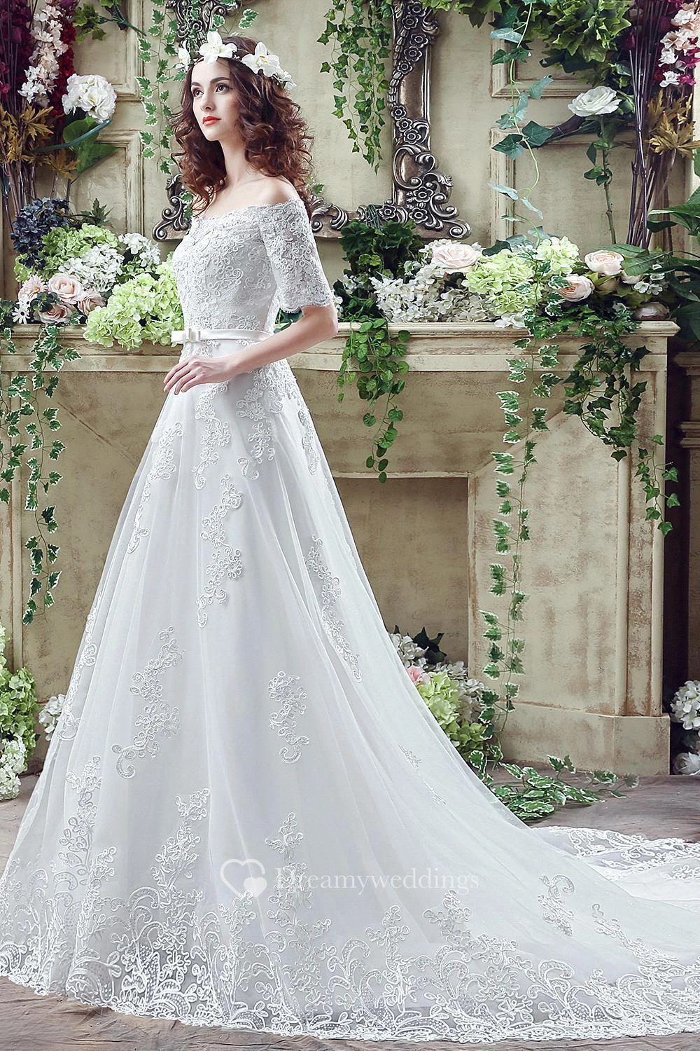 Off-shoulder style impart an all new fashion to the wedding gown. It looks eye-catching and sexy. Lace-up back with train make it perfect for any type of wedding. I love this dress a lot and waiting for my big day to wear it.