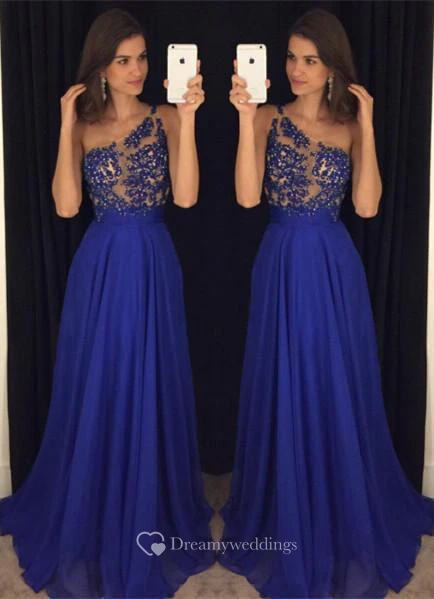 Elegant Royal Blur One Shoulder Prom Dresses Long Chiffon Appliques