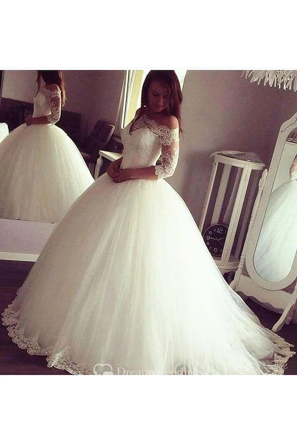 Elegant Sheer Long Sleeve Off the Shoulder Tulle Lace Appliqued Bridal Gown