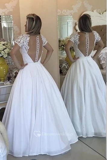 Elegant Short Sleeve Wedding Dresses A-Line Lace Appliques With Pearls