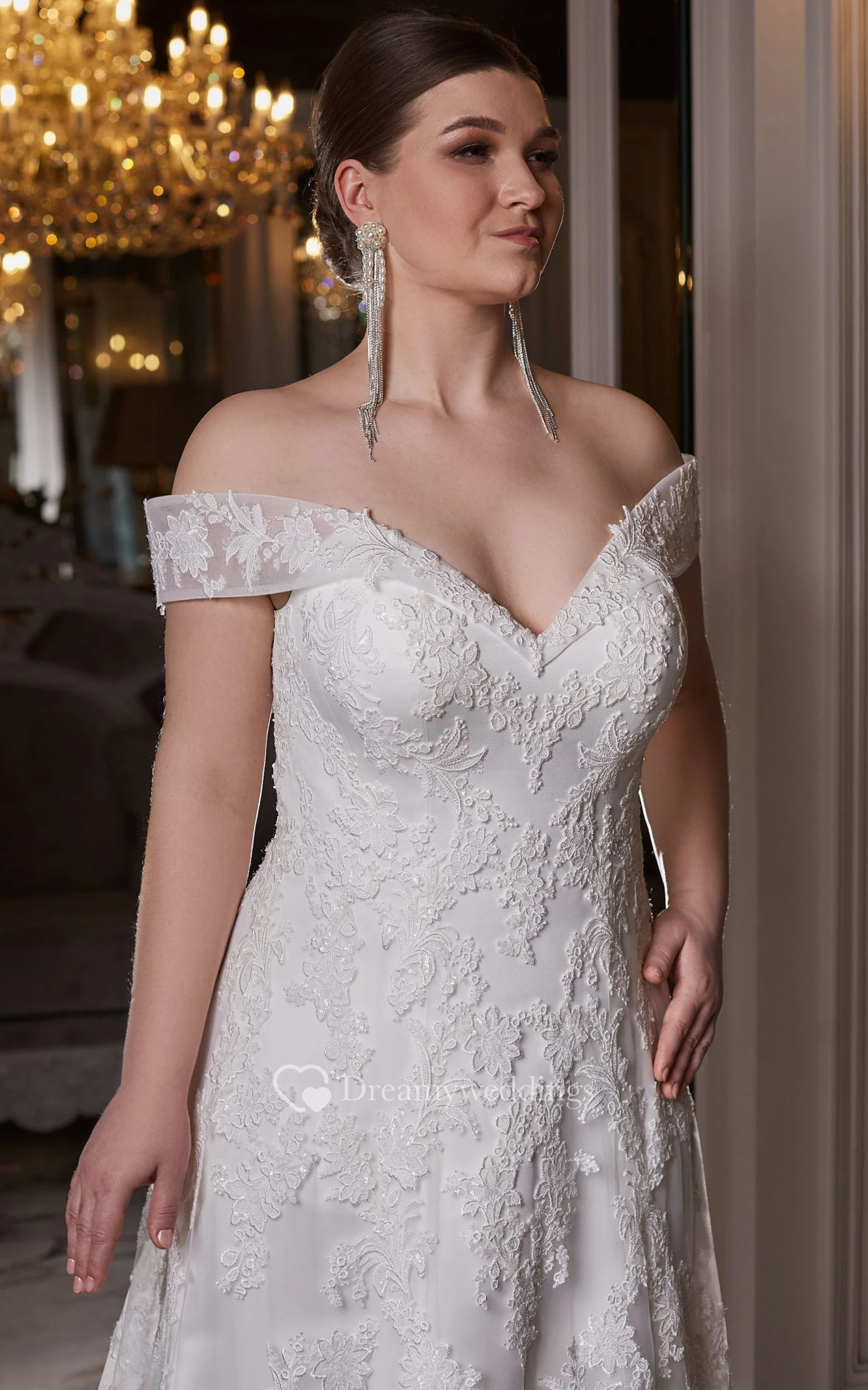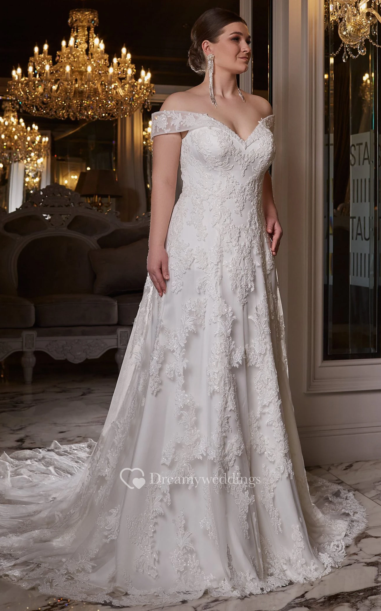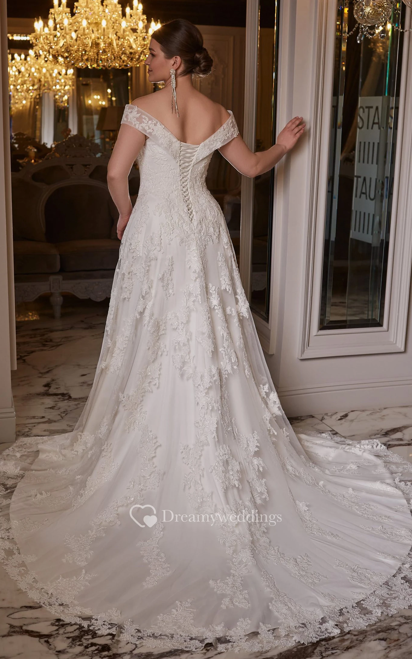 Elegant Short Sleeve Court Train Lace A Line Wedding Dress with Appliques