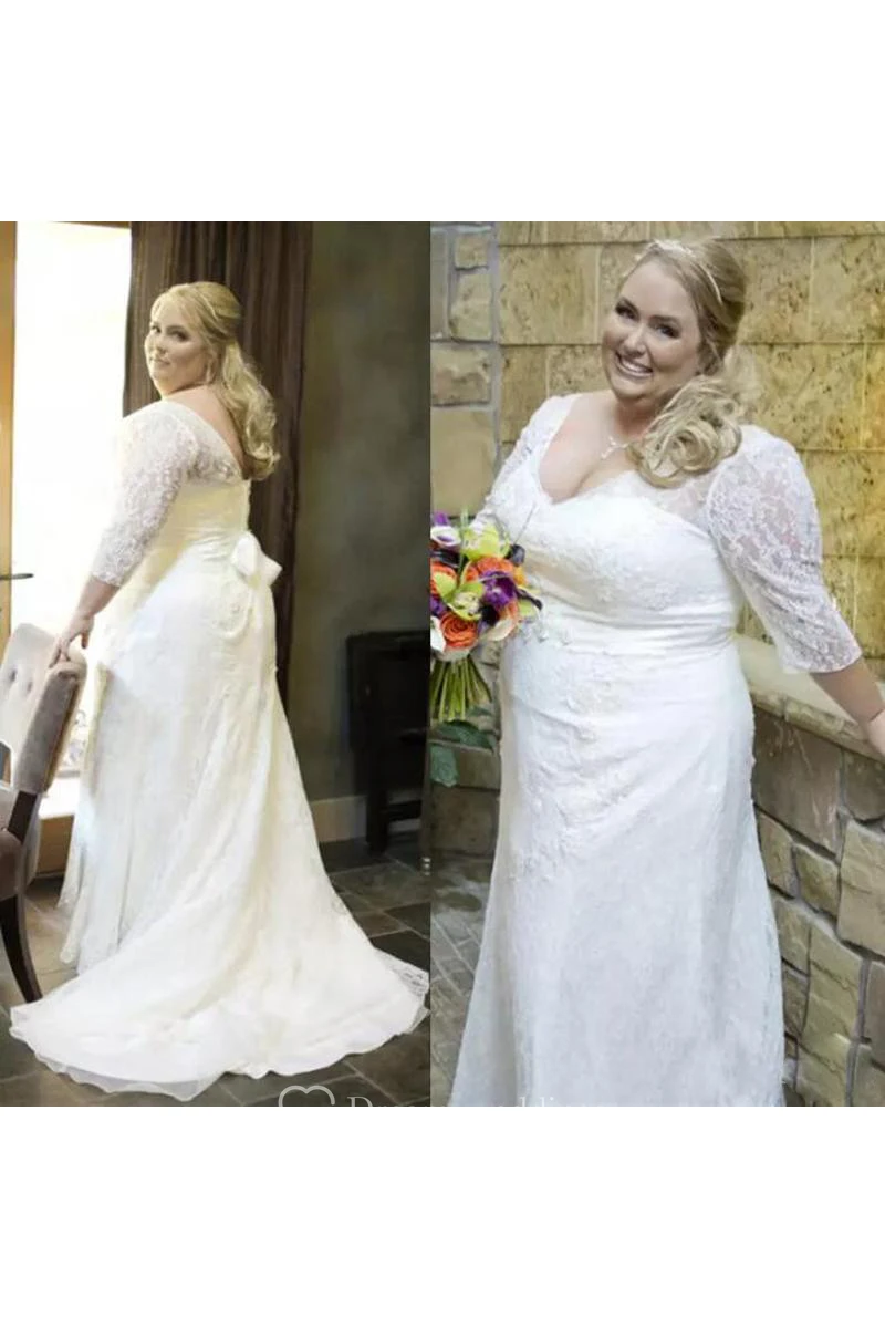 Elegant V Neck 3-4 Long Sleeves Lace Up Back Sash Plus Size Lace Wedding Dress