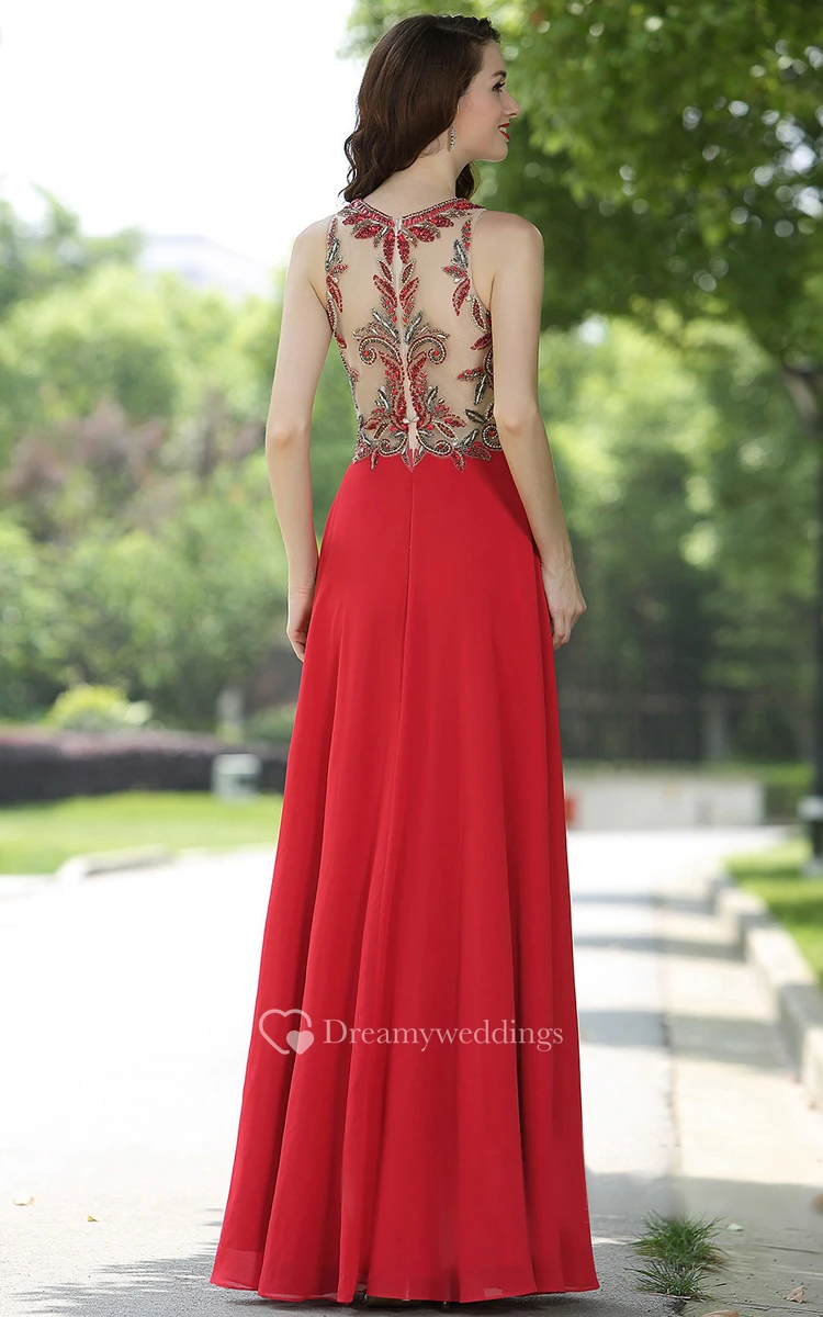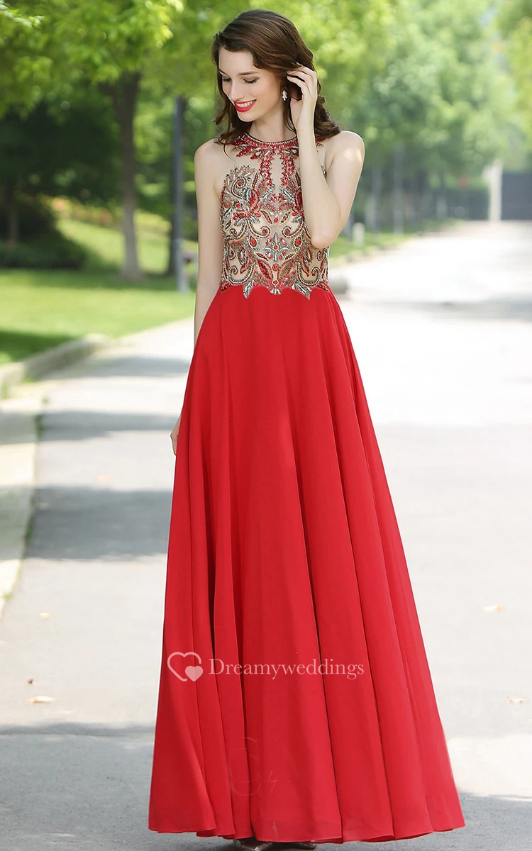 Empire Floor-Length Halter Sleeveless Empire Chiffon Appliques Illusion Dress