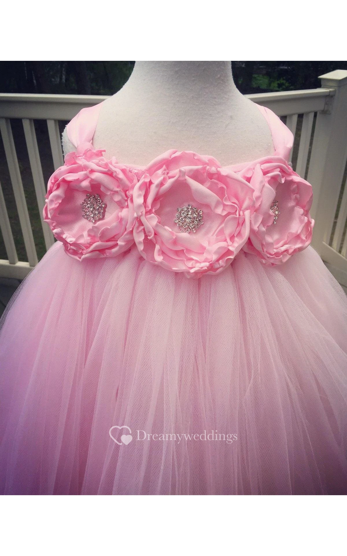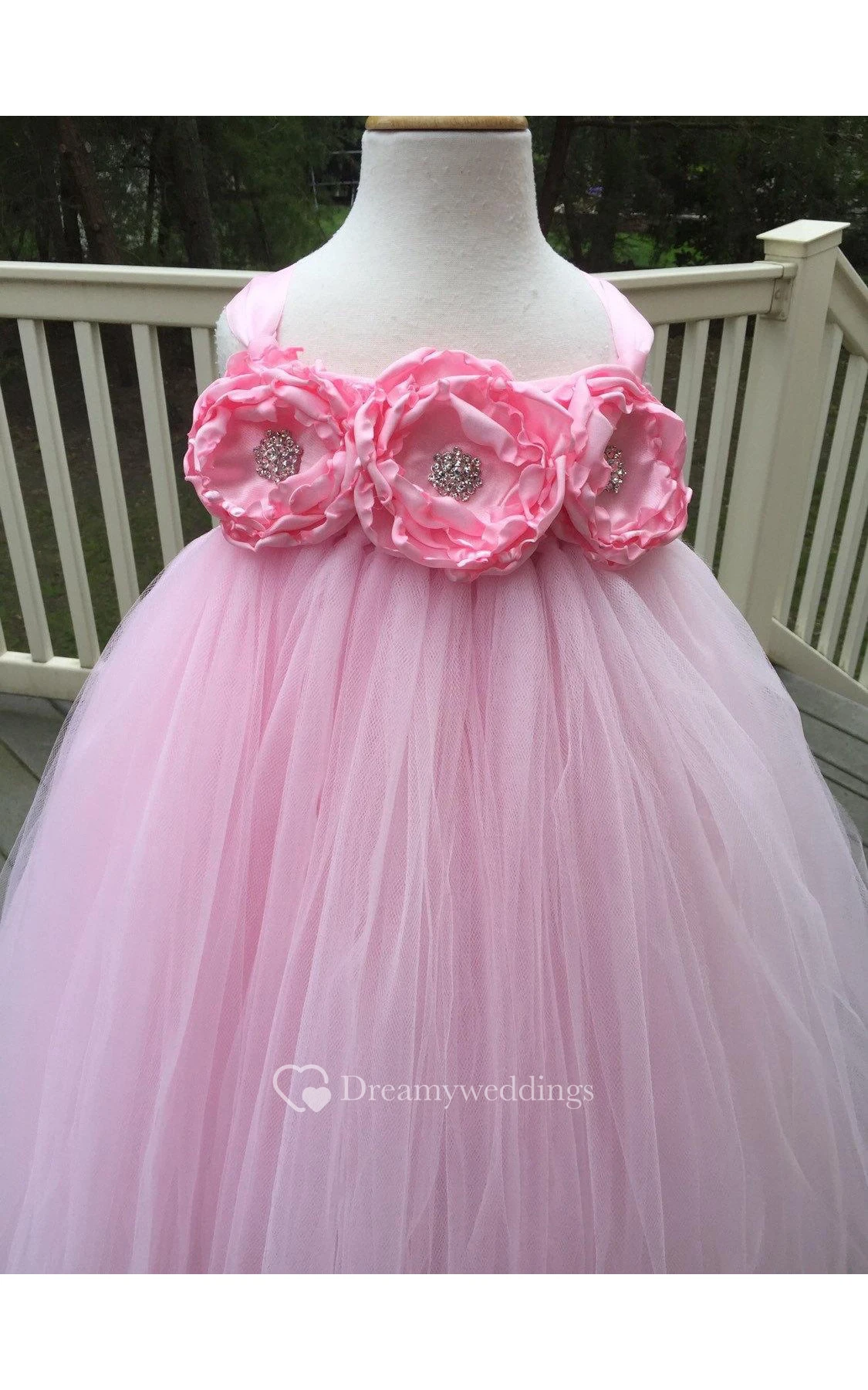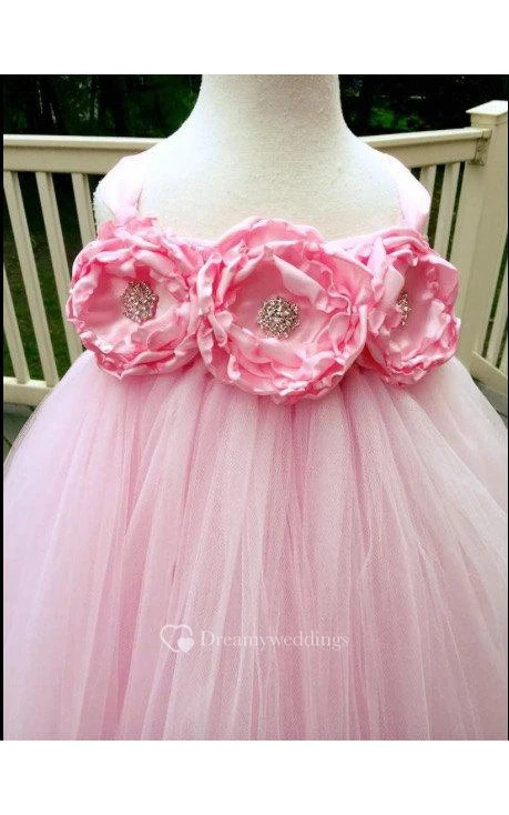 Empire Flower Bodice Pleated Tulle Gown With Ruffles