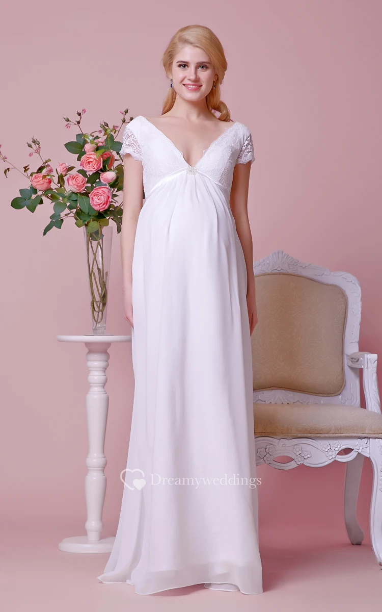 Empire Low-v Neck Cap-sleeved A-line Chiffon Long Dress With Pleats