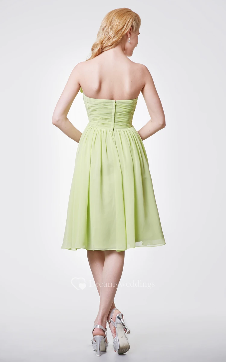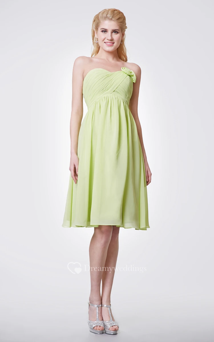 Your bridesmaids will look classic and beautiful in this elegant strapless empire a-line knee-length chiffon dress. A modern sweetheart neckline is accented by delicate ruching in an edgy crisscross pattern and eye-catching floral rosette embellishments. Intricate pleating decorates the waistline and the knee-length chiffon skirt, giving the dress beautiful movement as they walk down the aisle as members of your bridal party.