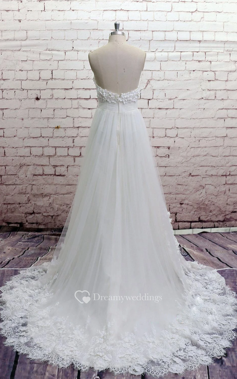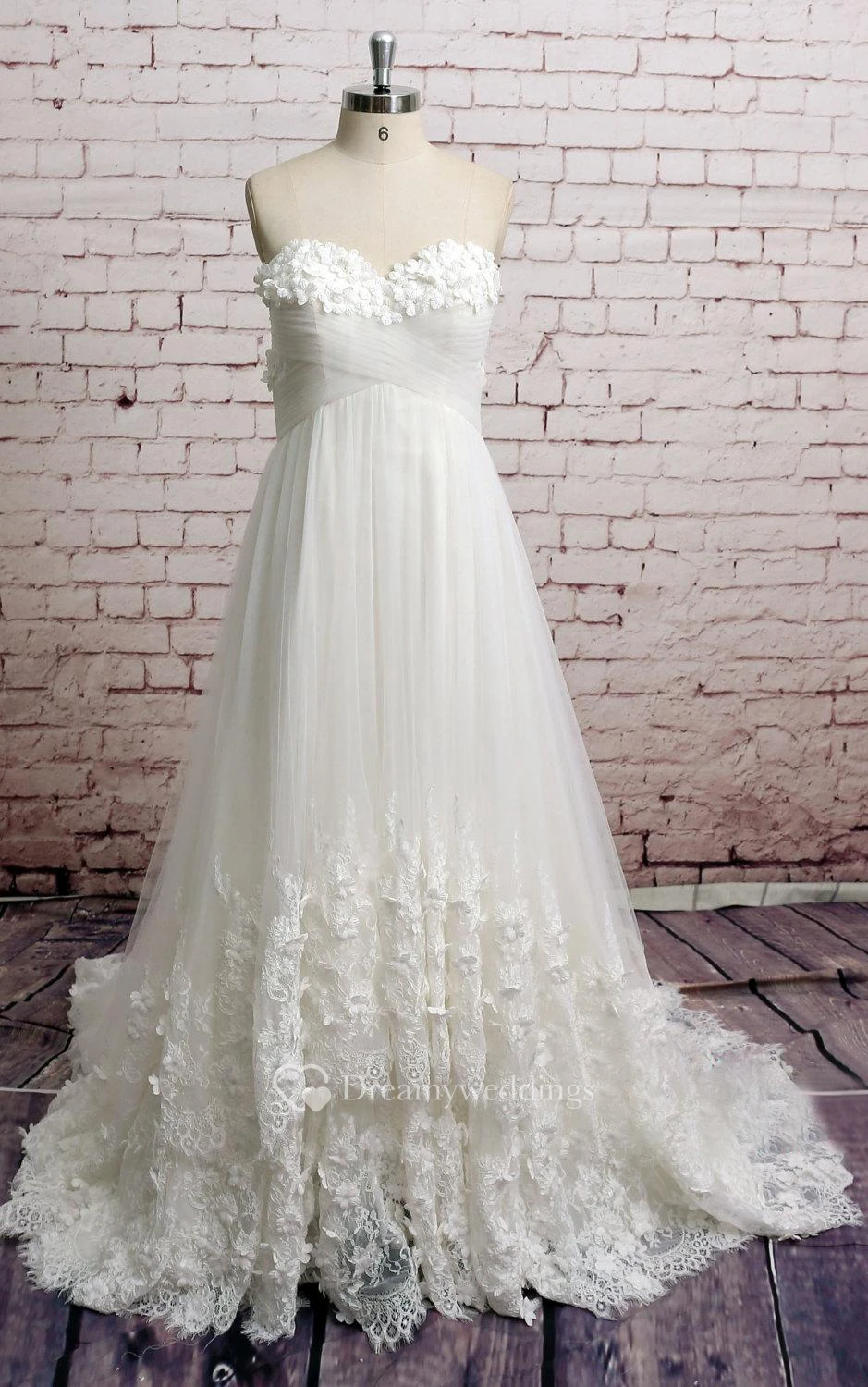Empire Sweetheart Lace and Tulle Dress With Petals and Crisscross Ruching