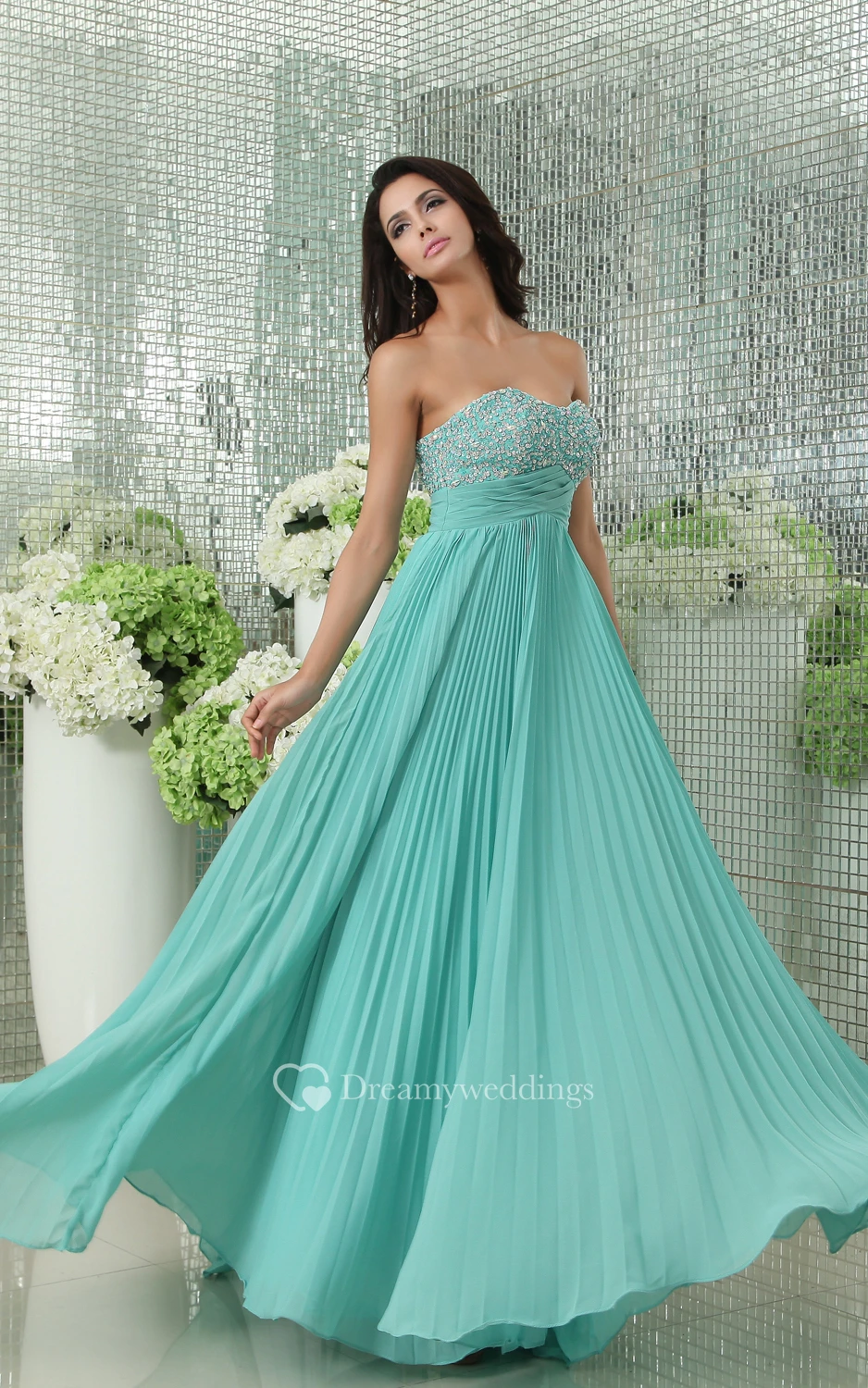 Empire Sweetheart Pleated A-Line Chiffon Gown Has Sequined Bodice