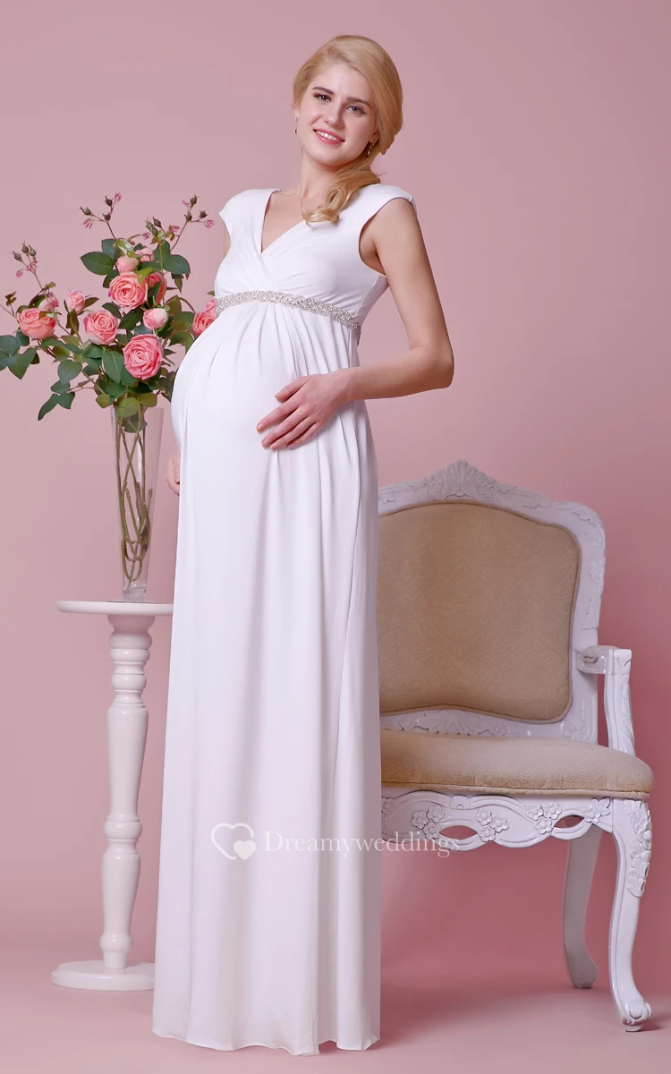 Empire V-neck Short-sleeved A-line Jersey Gown With Shiny Waist