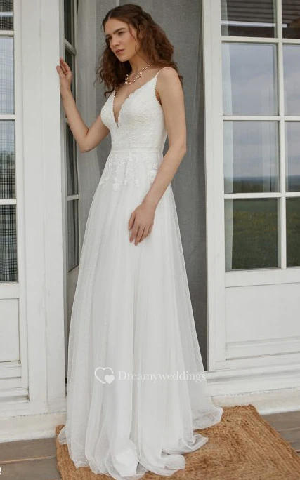 Ethereal Tulle Floor-length Sleeveless A Line Deep-V Back Wedding Dress with Appliques