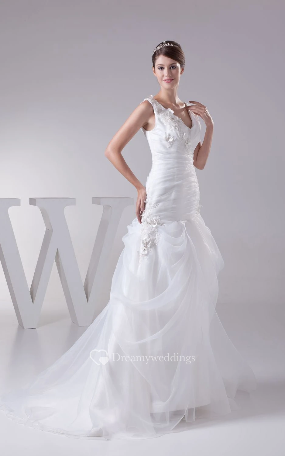 Ethereal V-Neck Ruched A-Line Dress With Flower and Tulle Overlay