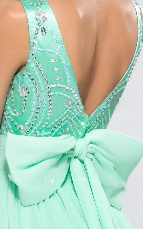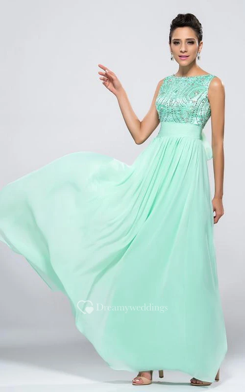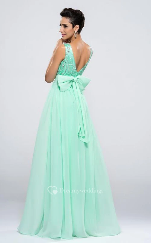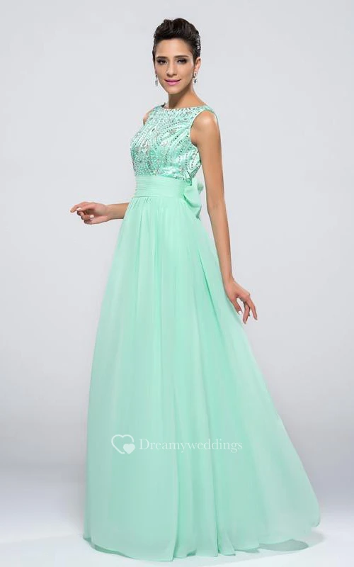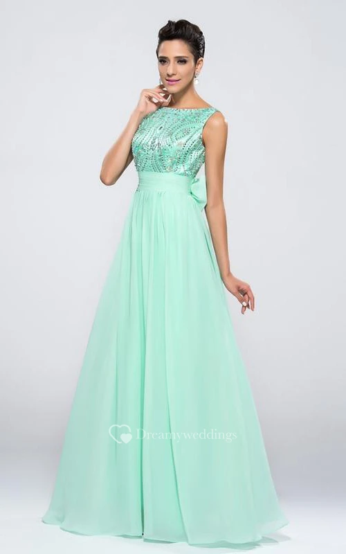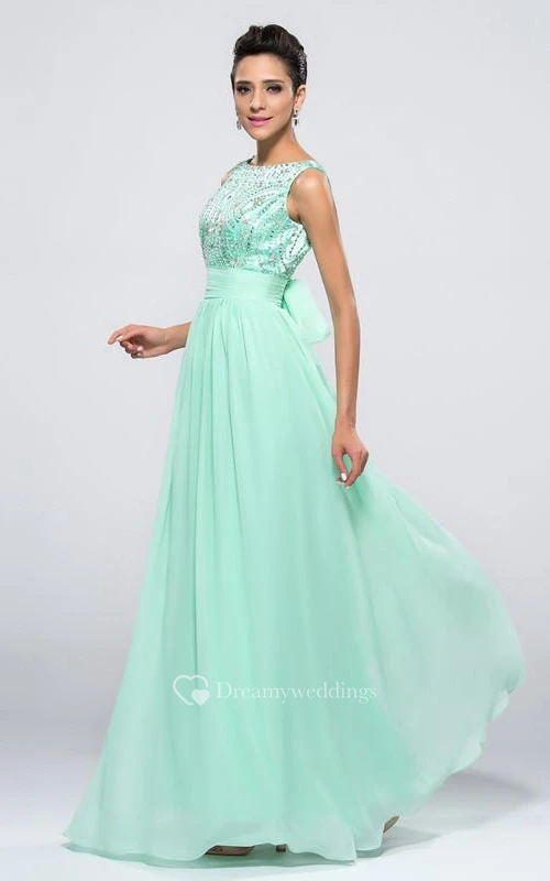 Fashion A-Line Bateau Sleeveless Bowknot Beaded Prom Dress