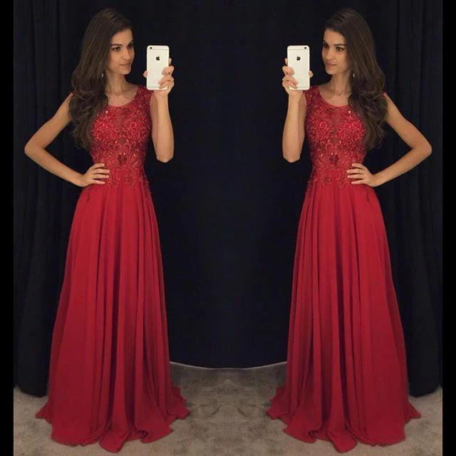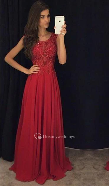 Fit and Flare Sleeveless Red Evening Dresses Lace Appliques Chiffon