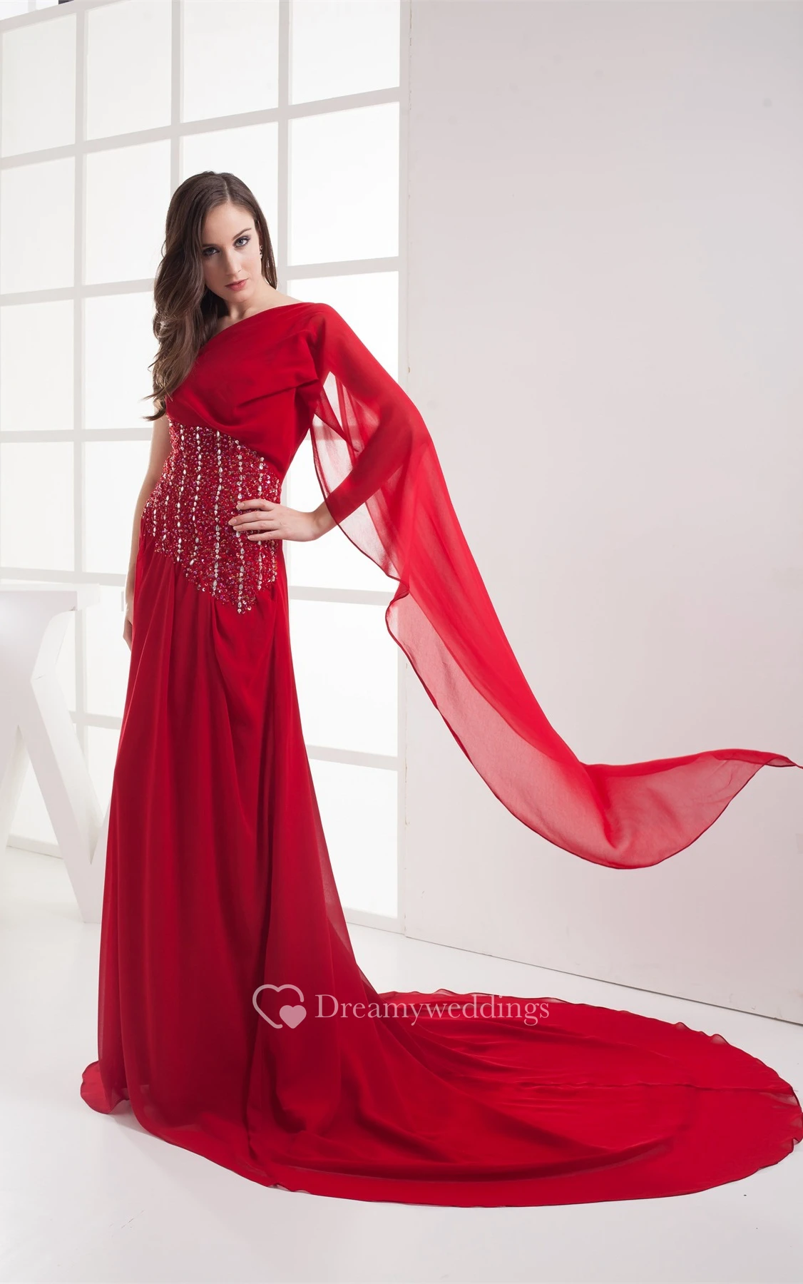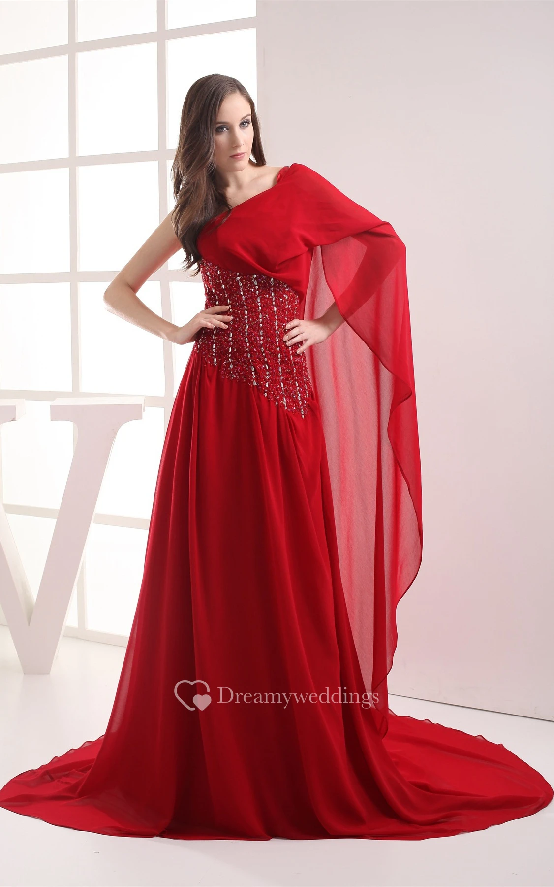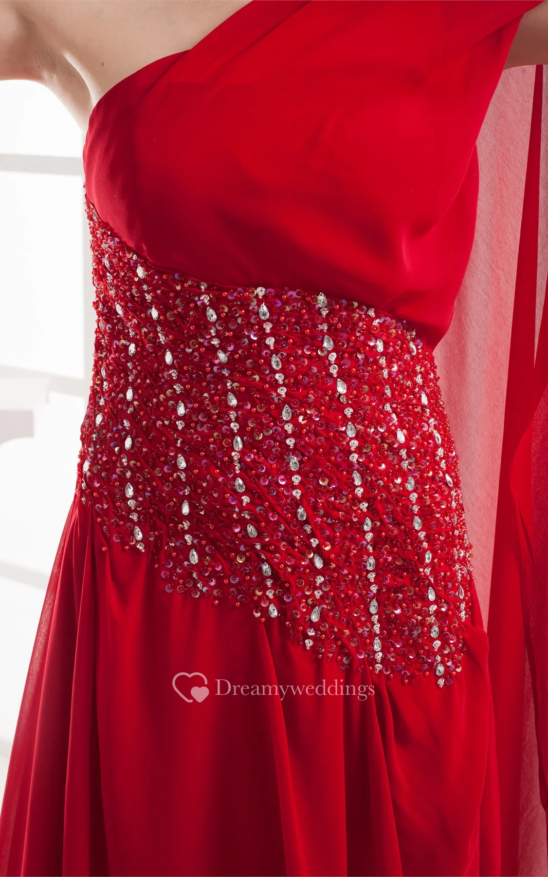Flay Chiffon Floor-Length Asymmetrical Gemmed Waist and Dress With Pleats