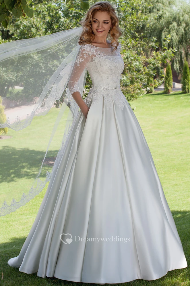 Floor-Length Ball Gown Appliqued Scoop Neck 3-4 Sleeve Satin Wedding Dress