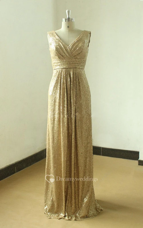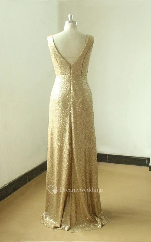 Floor-length Gold Sequined V-neck Gown With Low V Back