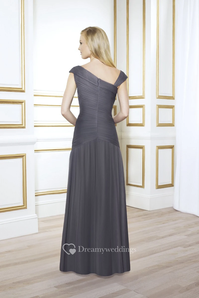 Floor-Length Ruched Cap Sleeve V-Neck Tulle Mother Of The Bride Dress With Broach