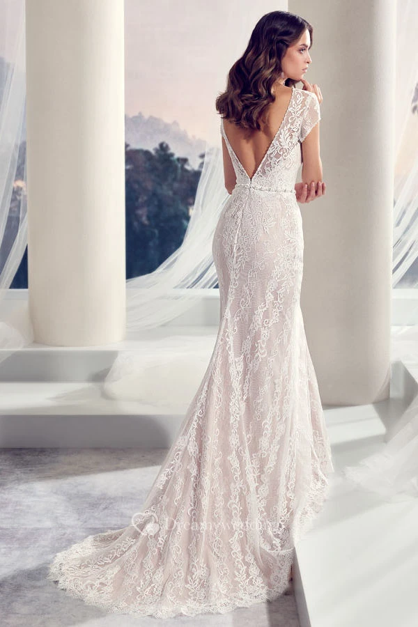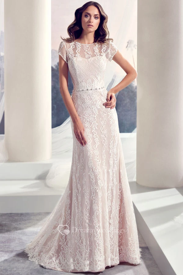 Floor-Length Scoop Jeweled Cap-Sleeve Lace Wedding Dress With Brush Train And V Back