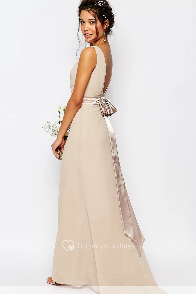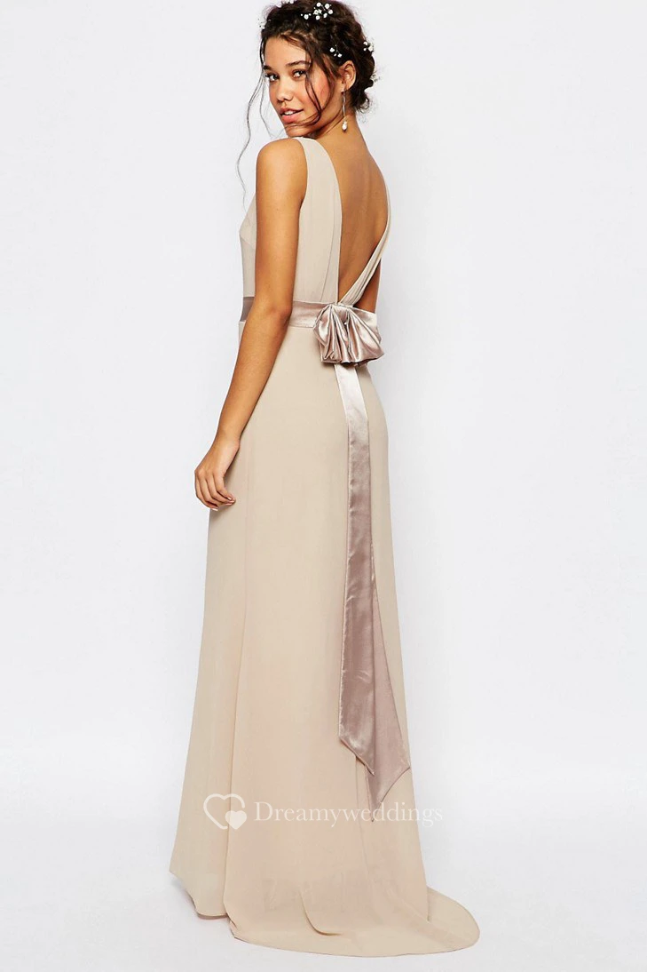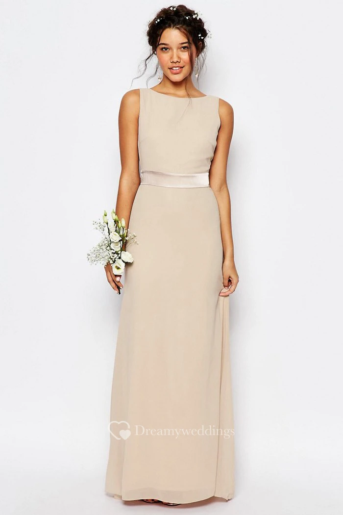 Floor-Length Sleeveless Bowed Bateau Neck Chiffon Bridesmaid Dress