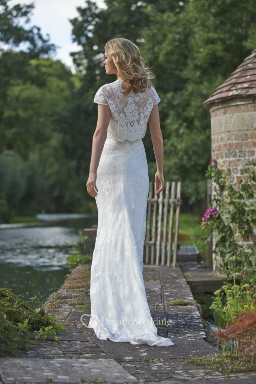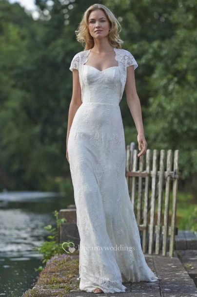 Floor-Length Square Cap-Sleeve Appliqued Lace Wedding Dress