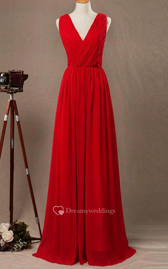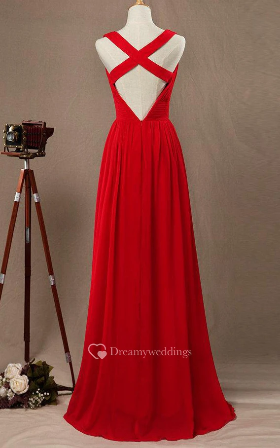 Floor-length Strapped V-neck Chiffon&Satin Dress With Criss cross