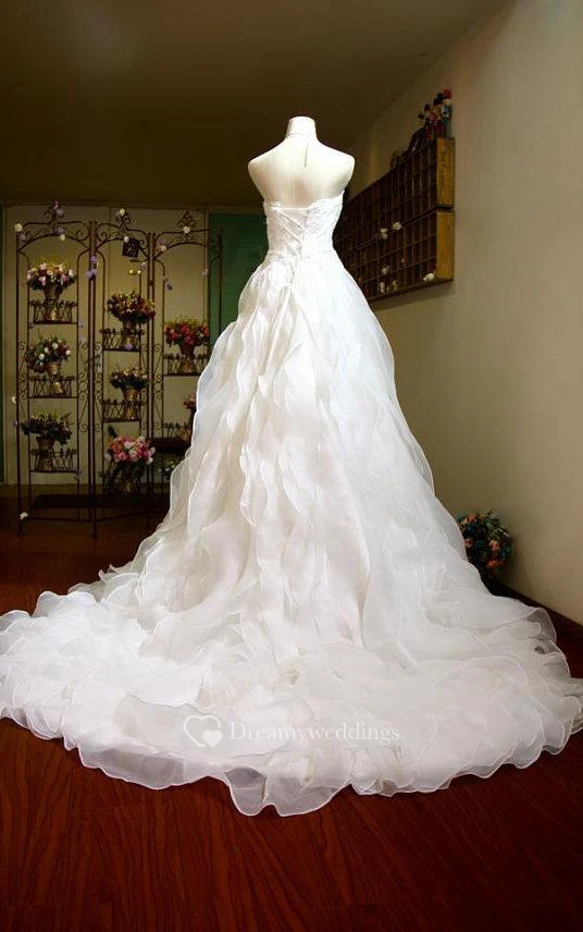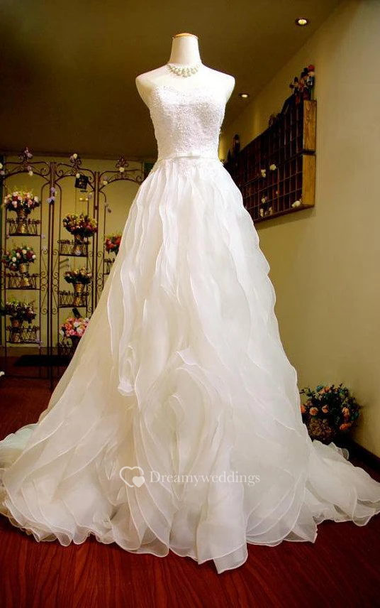 Floor-Length Sweetheart Cap Appliques Ruffles Keyhole Lace Organza Dress