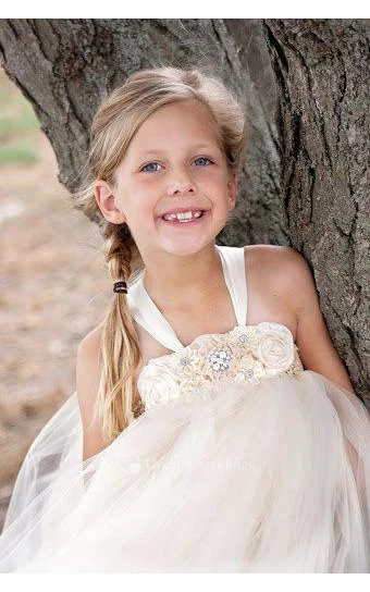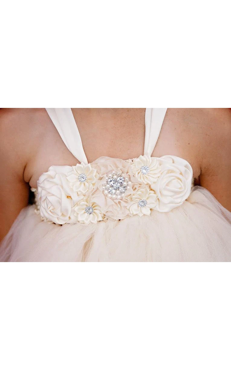 Floral Bodice Empire Tulle Knee Length Dress With Jewel and Rhinestone