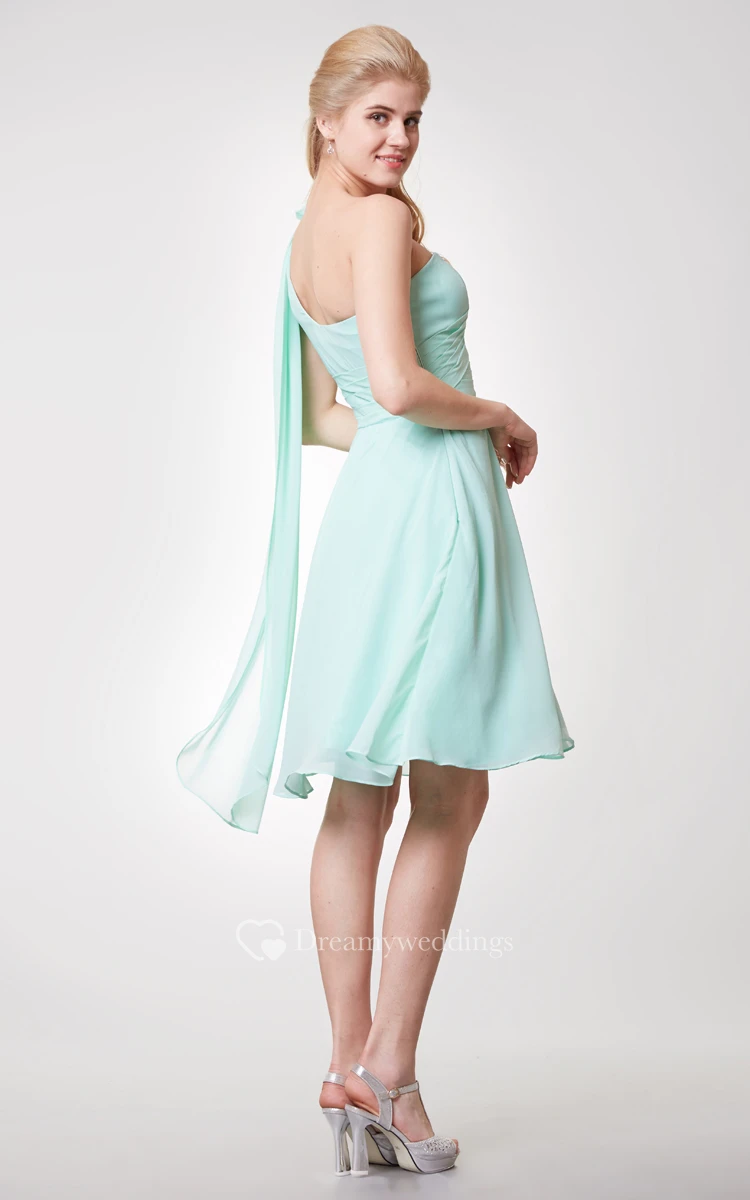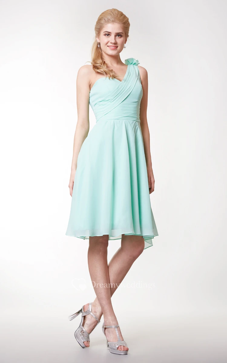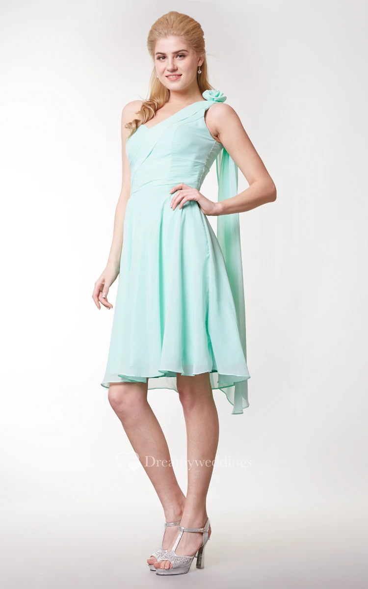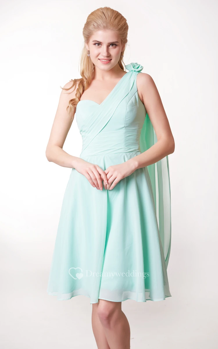 Floral One Shoulder Side Draped Knee Length Chiffon Dress