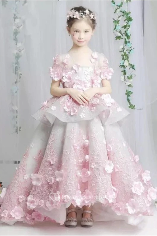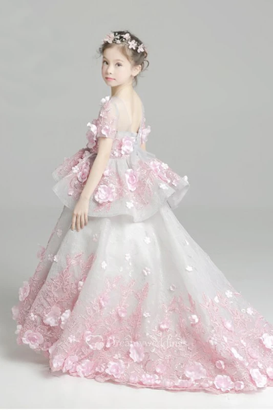 Floral Scoop-Neck Short Sleeve Tier Ball Gown Flower Girl Dress