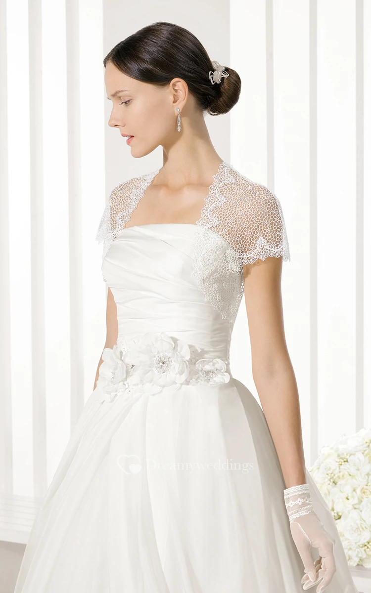Floral Waistbtulle Top-Ruched Gown With Lace Cape